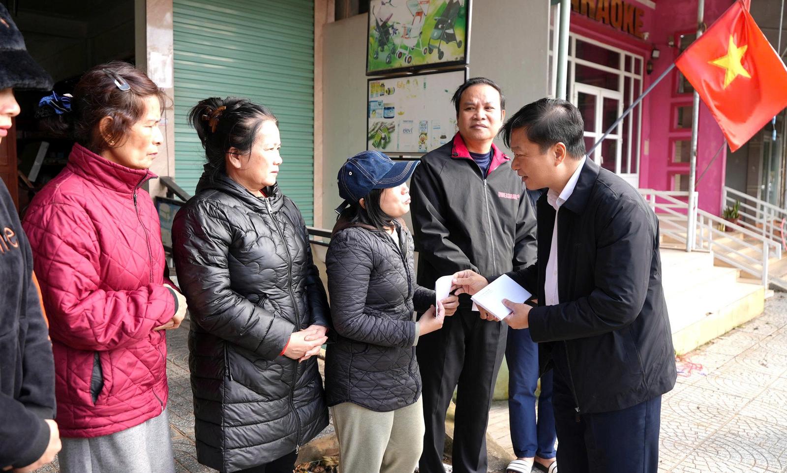 Chủ tịch UBND tỉnh Quảng Trị Lê Hồng Vinh thăm hỏi, động viên và tặng quà chia sẻ khó khăn với những hộ dân bị thiệt hại tại xã Khe Sanh. Ảnh: Mỹ Hạnh