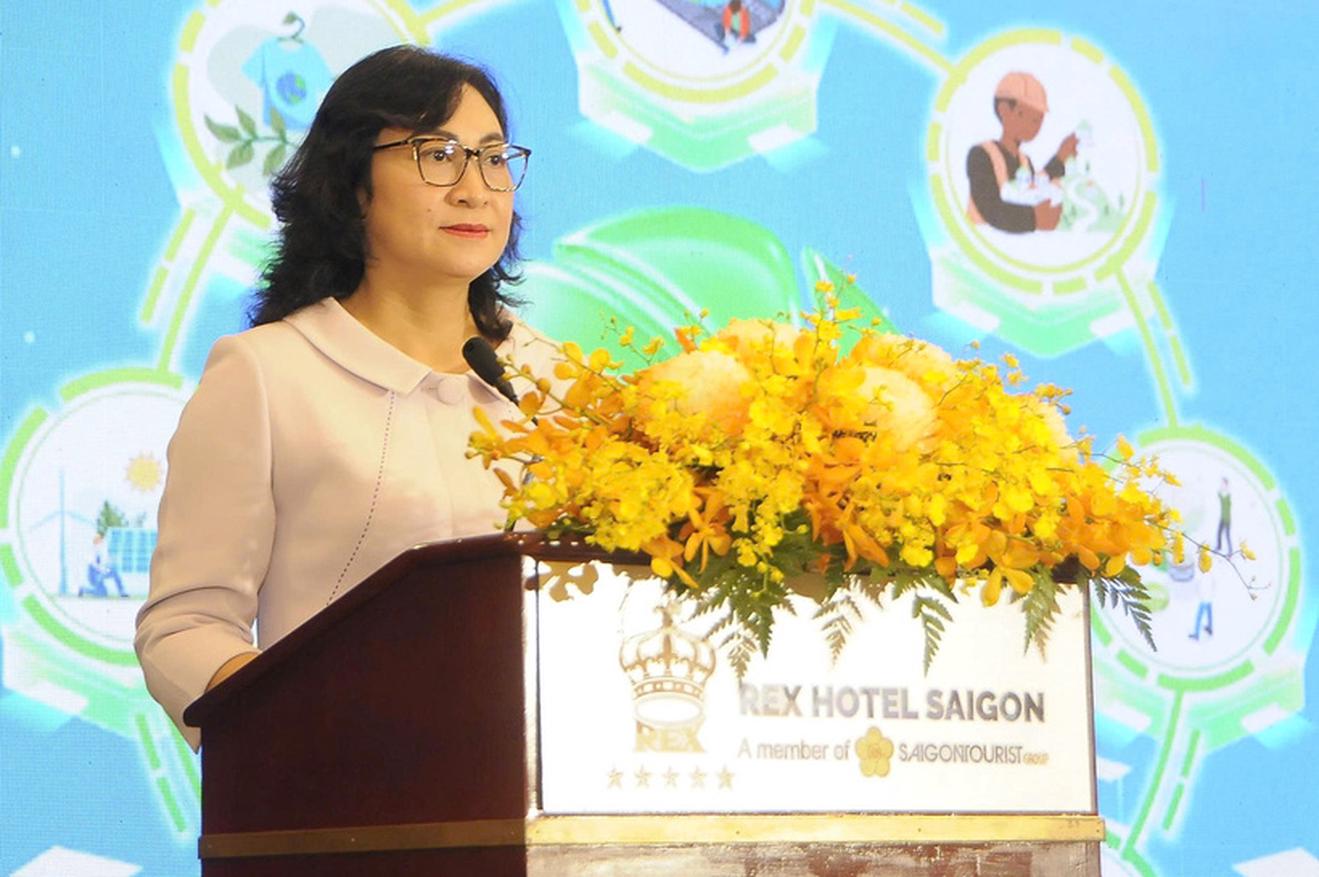 Thứ trưởng Bộ Công Thương Phan Thị Thắng và đại diện các đơn vị thực hiện nghi thức công bố EcoHub - Sàn giao dịch thương mại điện tử B2B xanh đầu tiên của Việt Nam tại TP Hồ Chí Minh. Ảnh: MK