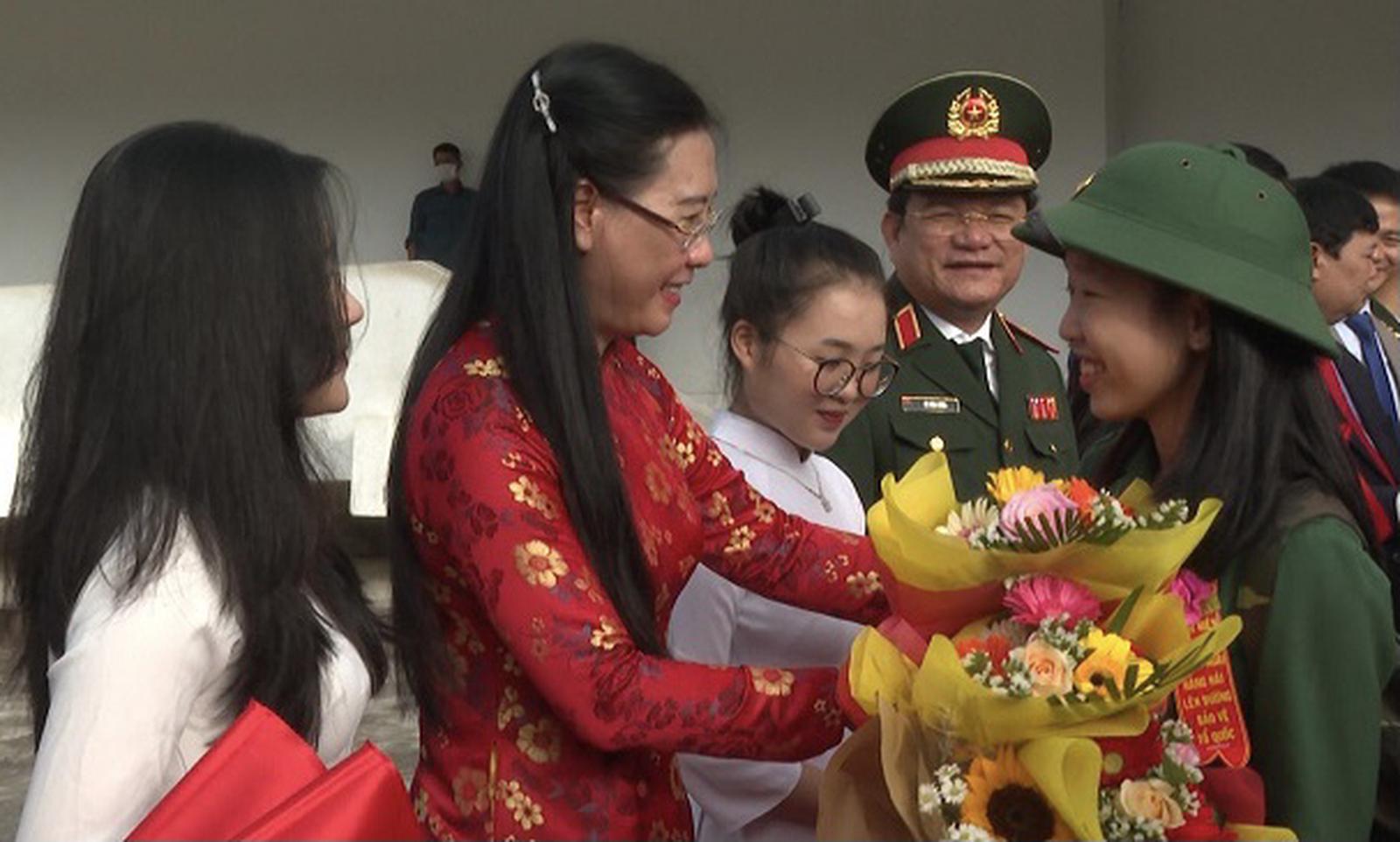 Bí thư Tỉnh uỷ Quảng Ngãi Bùi Thị Quỳnh Vân tặng hoa các tân binh. Ảnh: P.B