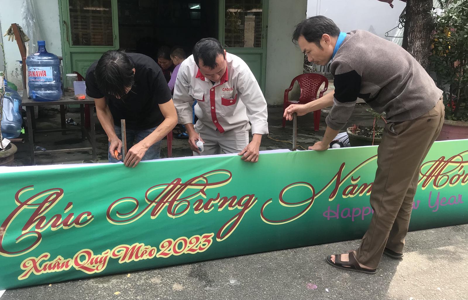 Người dân Quảng Nam hồ hởi góp công sức dựng cổng chào đón Tết tại đường phố, khu dân cư.
