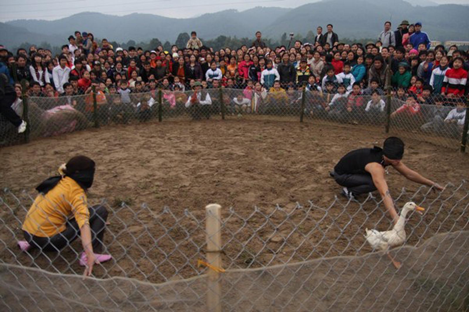 Trò chơi dân gian “Bịt mắt bắt vịt” của đồng bào dân tộc Mường, xã Thạch Khoán (huyện Thanh Sơn). Ảnh: Huy Minh