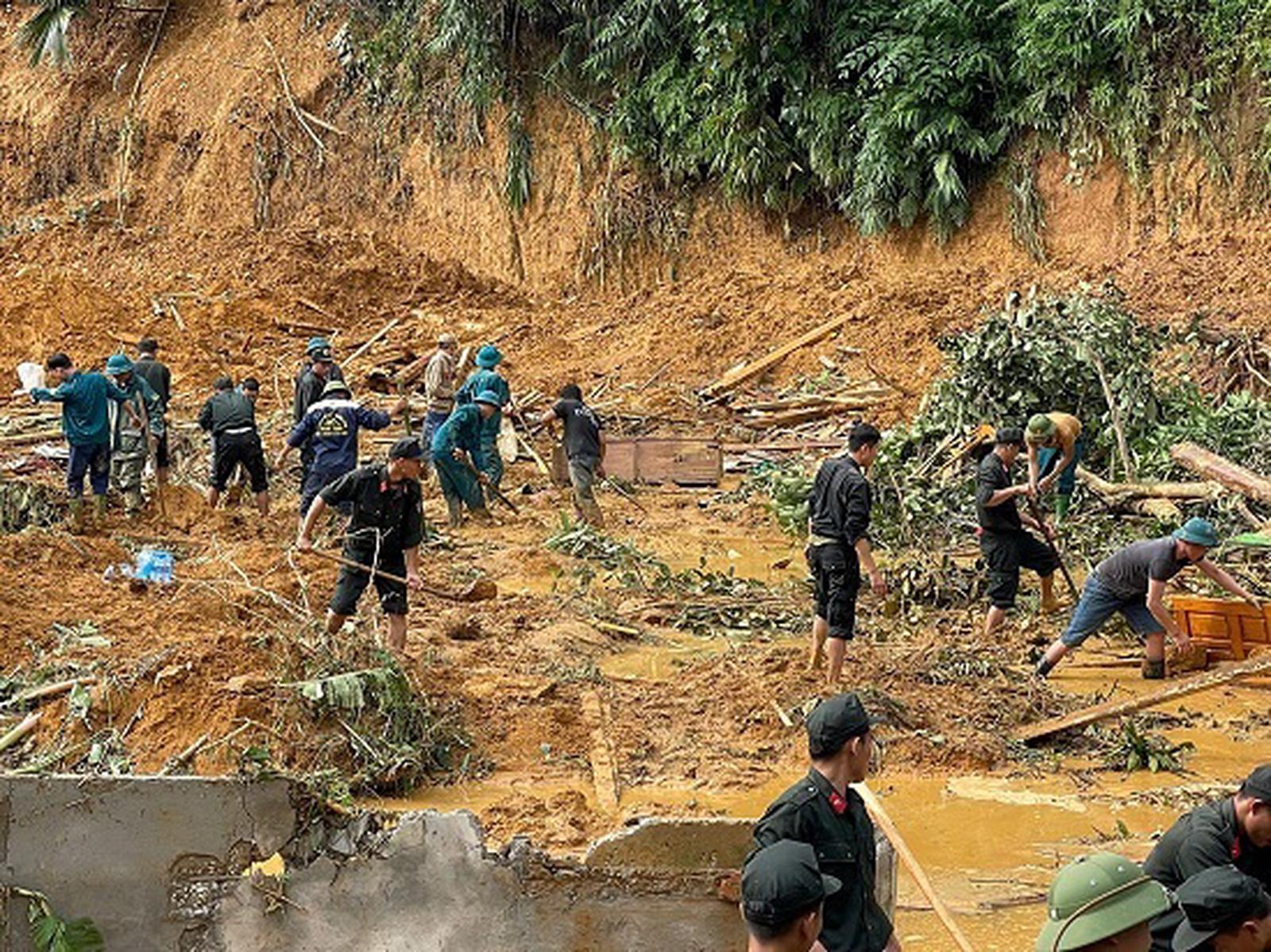 Các lực lượng tham gia tìm kiếm người mất tích vụ sạt lở đất tại thông Làng Át, xã Minh Xuân. Ảnh: Bùi Bình