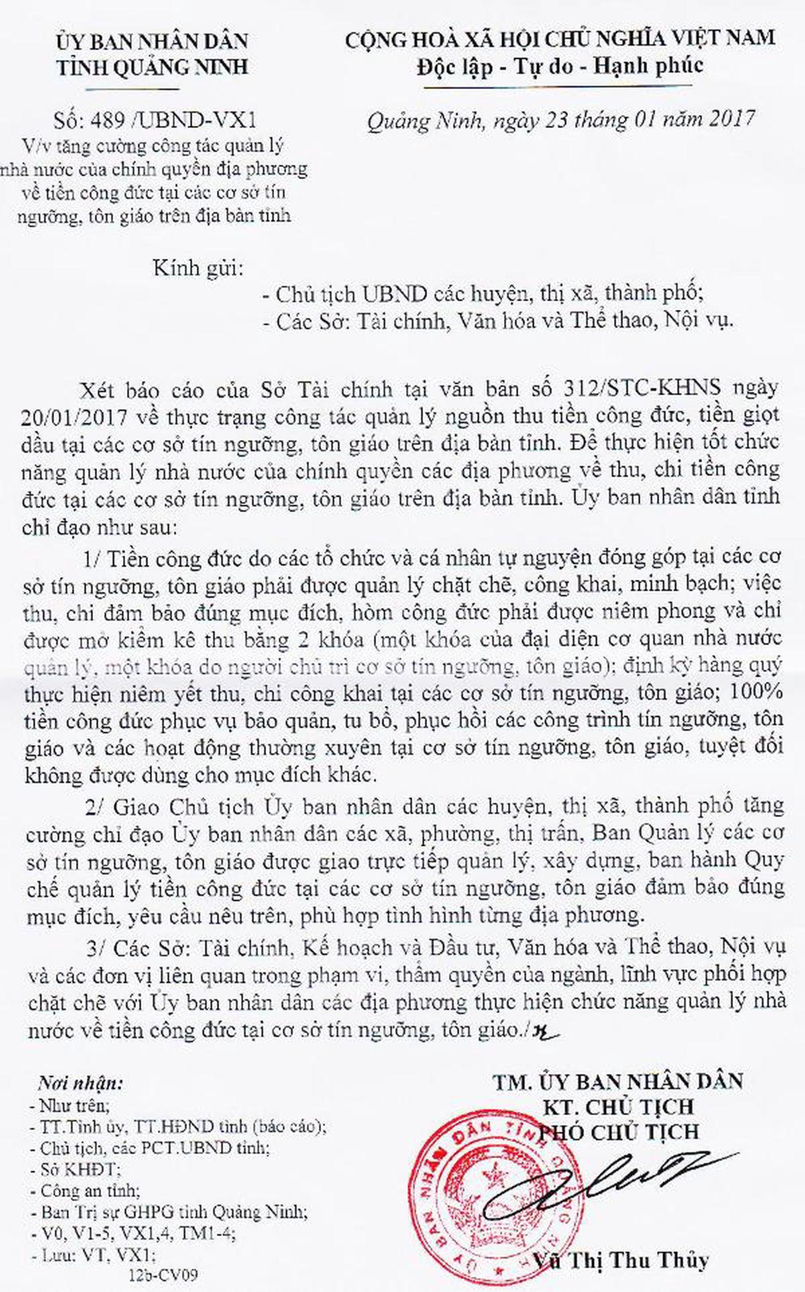 Cụ thể, trước đó, UBND tỉnh Quảng Ninh từng ban hành Văn bản số 489/UB - VX1, ngày 23/1/2017 “về việc tăng cường công tác quản lý Nhà nước của chính quyền địa phương về tiền công đức tại các cơ sở tín ngưỡng, tôn giáo trên địa bàn tỉnh”.