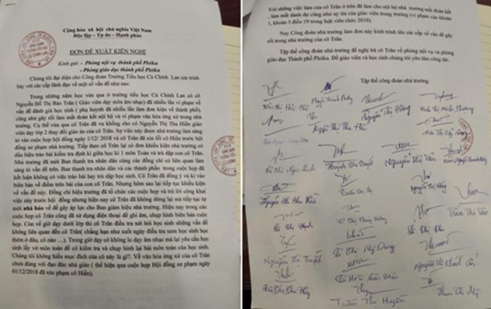 Sau đó, tập thể giáo viên nhà trường đã viết đơn kiến nghị “đòi trả” cô Trân về Phòng GD&ĐT với lý do mất đoàn kết, dù nữ giáo viên này không vi phạm gì…
