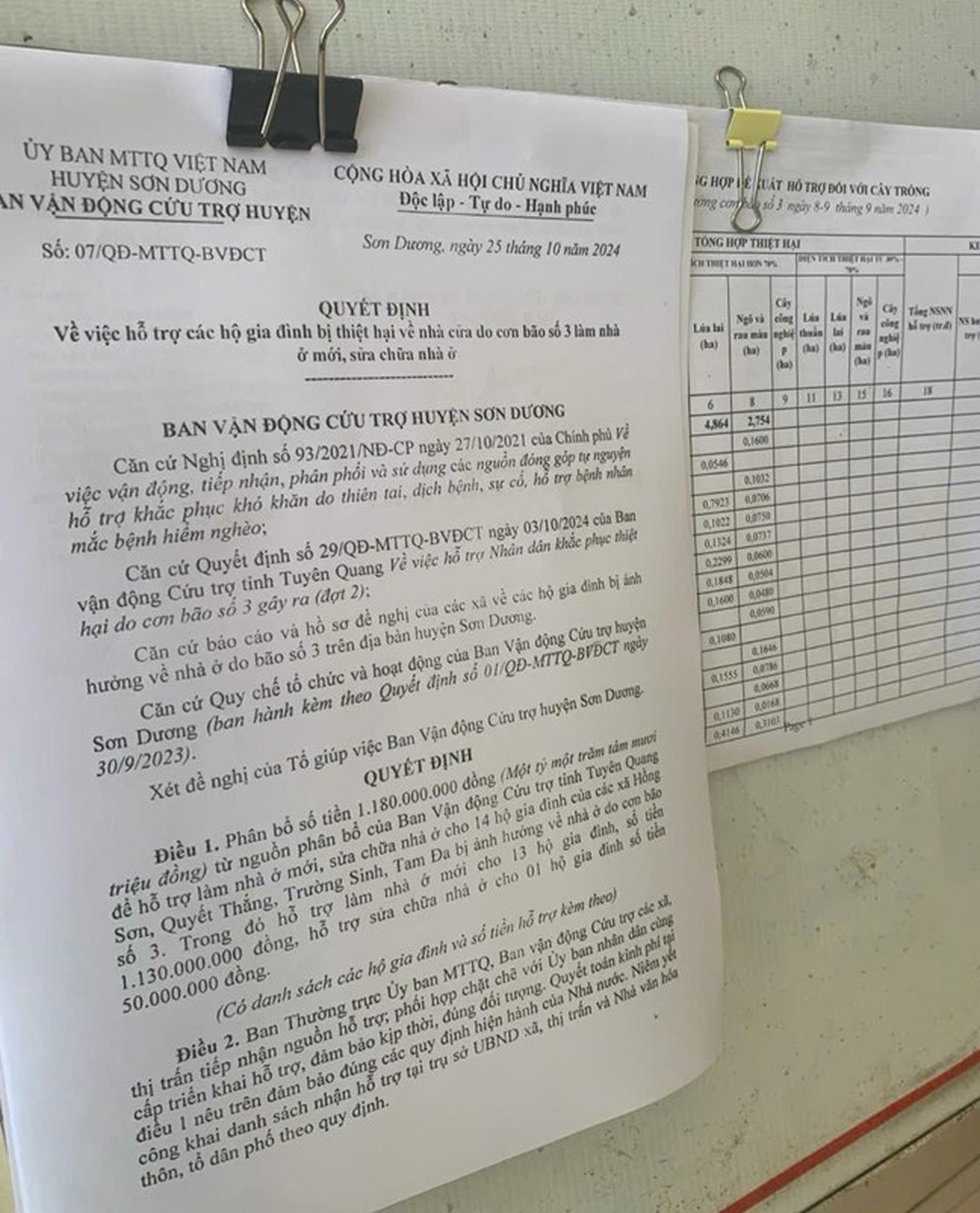 Đồng thời, các quyết định chi hỗ trợ được Ban Vận động cứu trợ tỉnh gửi đến HĐND tỉnh, Báo Tuyên Quang, Đài Phát thanh và Truyền hình tỉnh để người dân cùng thực hiện công tác giám sát và tuyên truyền; UBND, Ban Vận động cứu trợ cấp xã, nơi có đối tượng được hỗ trợ cũng phải thực hiện niêm yết công khai đối tượng, nội dung, mức hỗ trợ tại trụ sở UBND xã, phường, thị trấn và nhà văn hóa các thôn, tổ dân phố.