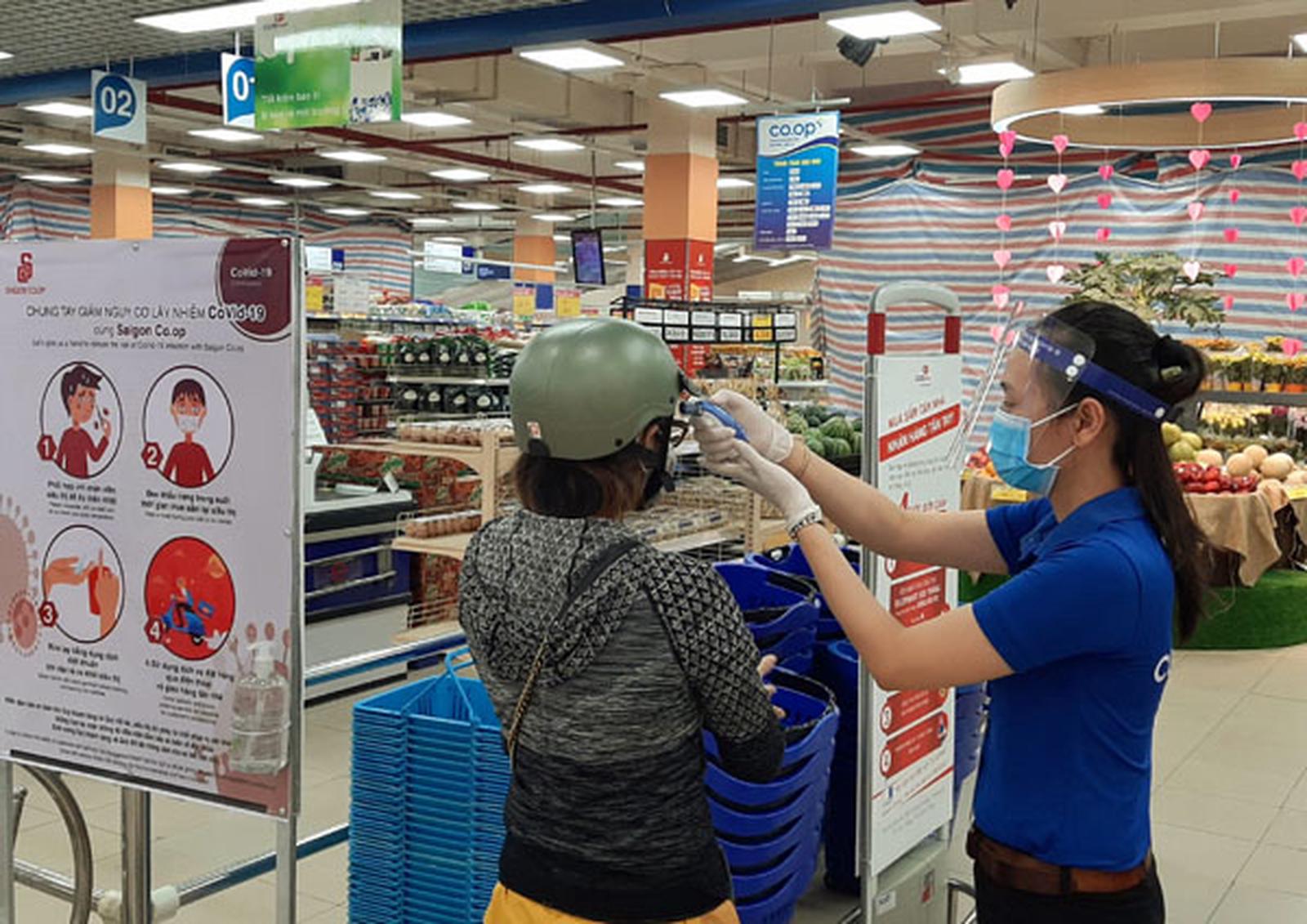 Tại các siêu thị như Coop Mart, Winmart… người dân được đo thân nhiệt trước khi vào mua sắm hàng hóa.