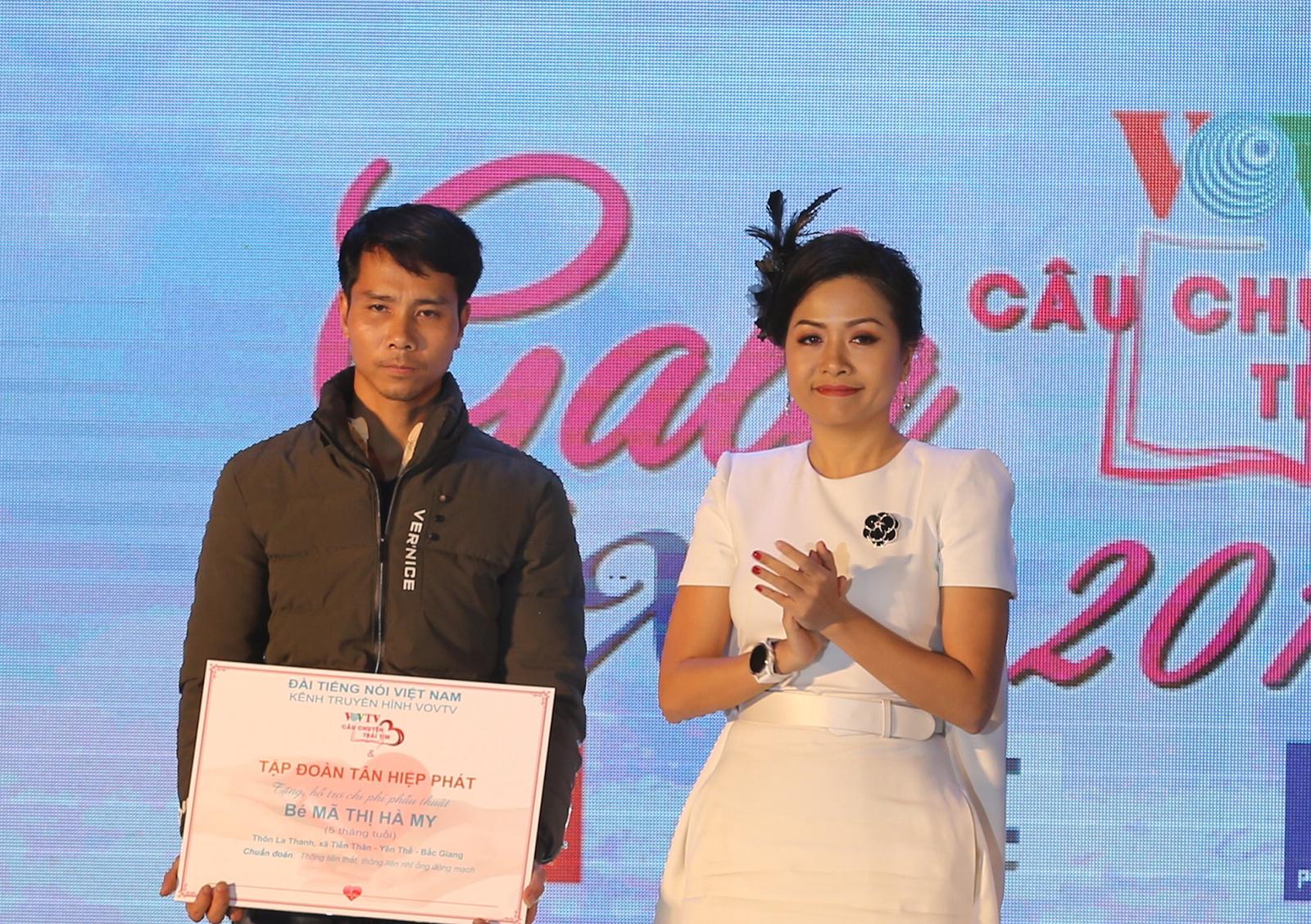 Bà Trần Uyên Phương, Phó Tổng giám đốc Tập đoàn Tân Hiệp Phát trao tượng trưng chi phí hỗ trợ phẫu thuật tim cho gia đình bé Mã Thị Hà My.