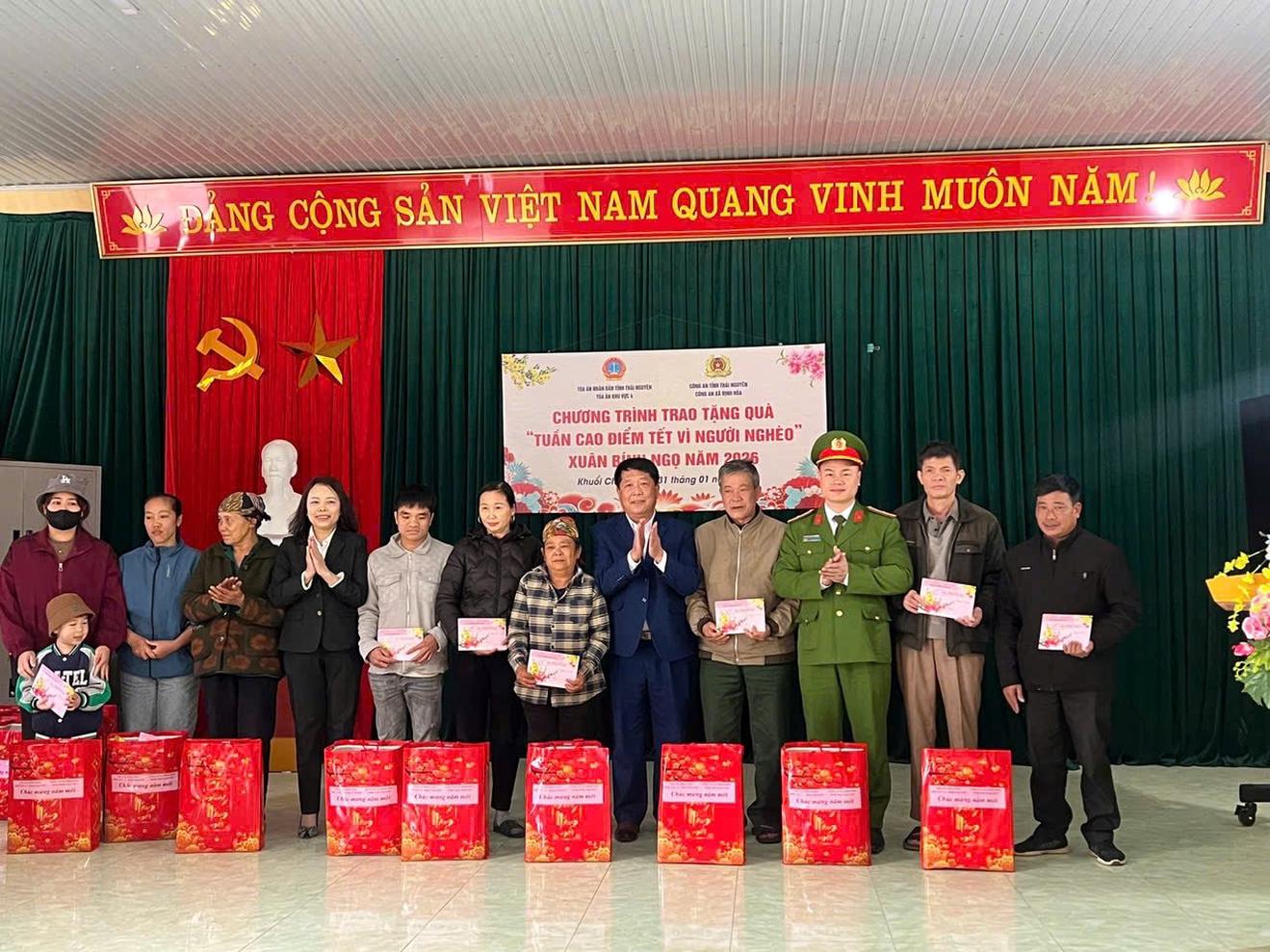 Với mục tiêu chương trình “Vì người nghèo – Không để ai bị bỏ lại phía sau”, TAND khu vực 4 – Thái Nguyên phối hợp với Công an xã Định Hóa tổ chức chương trình tặng quà Tết “Vì người nghèo năm 2026” cho các hộ nghèo, hộ có hoàn cảnh đặc biệt khó khăn trên địa bàn.