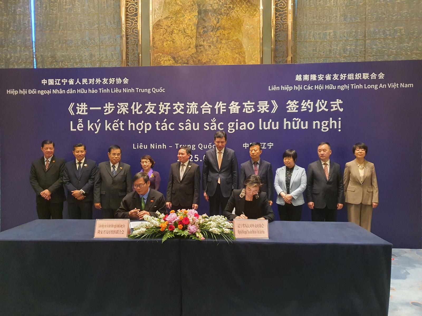 Trong khuôn khổ buổi làm việc, lãnh đạo hai tỉnh đã chứng kiến Lễ ký kết Biên bản ghi nhớ về tăng cường giao lưu hữu nghị và hợp tác giữa Hiệp hội Đối ngoại nhân dân hữu hảo tỉnh Liêu Ninh và Liên hiệp các tổ chức hữu nghị tỉnh Long An. Sự kiện này đánh dấu một bước tiến mới trong quan hệ đối ngoại Nhân dân giữa hai tỉnh, vốn đã được thiết lập từ năm 2015, và cụ thể hóa những nội dung hợp tác đã được thống nhất.