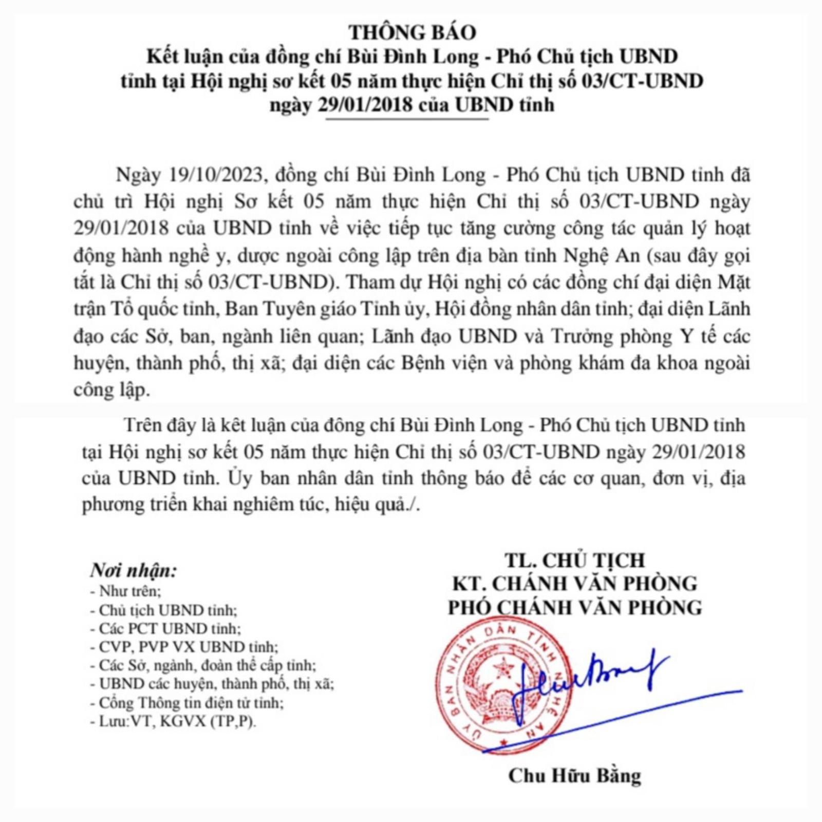 Thông báo của Văn phòng UBND tỉnh Nghệ An về kết luận của Phó Chủ tịch UBND tỉnh đối với hoạt động hành nghề y, dược tư nhân. Ảnh: XT