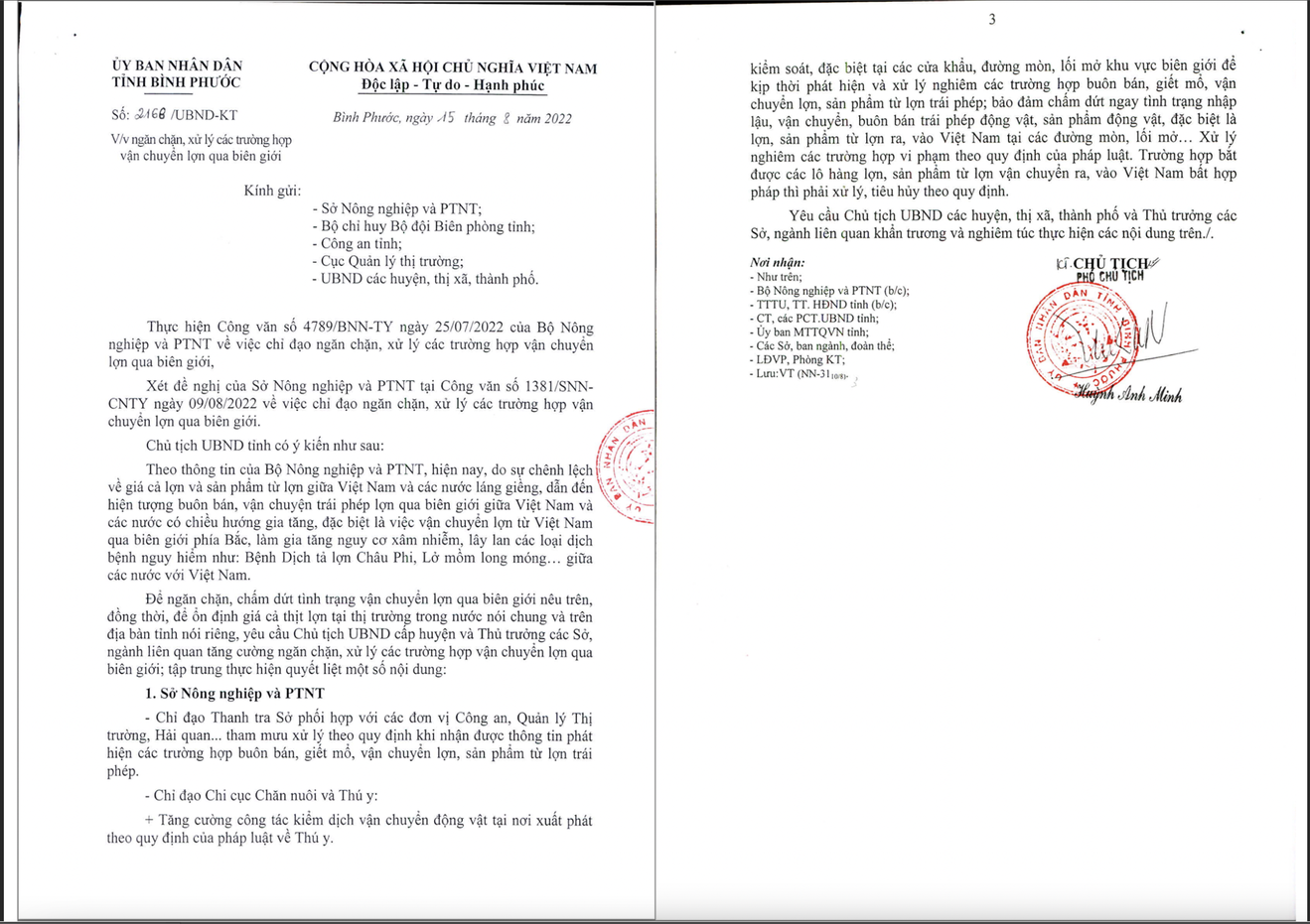 (Thanh tra) - UBND tỉnh Bình Phước đã có công văn giao các sở, ban ngành liên quan và UBND các huyện, thị xã, TP để triển khai thực hiện các nội dung chỉ đạo của Bộ Nông nghiệp và Phát triển nông thôn về việc ngăn chặn, xử lý các trường hợp vận chuyển lợn qua biên giới theo quy định.