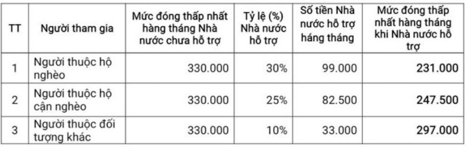 Đồng thời, mức hỗ trợ tiền đóng của Nhà nước đối với người tham gia BHXH tự nguyện cũng tăng lên. Theo đó, đối với người tham gia thuộc: hộ nghèo - số tiền hỗ trợ tăng từ 46.200 đồng lên 99.000 đồng/tháng (tăng 52.800 đồng); hộ cận nghèo - số tiền hỗ trợ tăng từ 38.500 đồng lên 82.500 đồng/tháng (tăng 44.000 đồng) và đối tượng khác - số tiền hỗ trợ tăng từ 15.400 đồng lên 33.000 đồng/tháng (tăng 17.600 đồng).