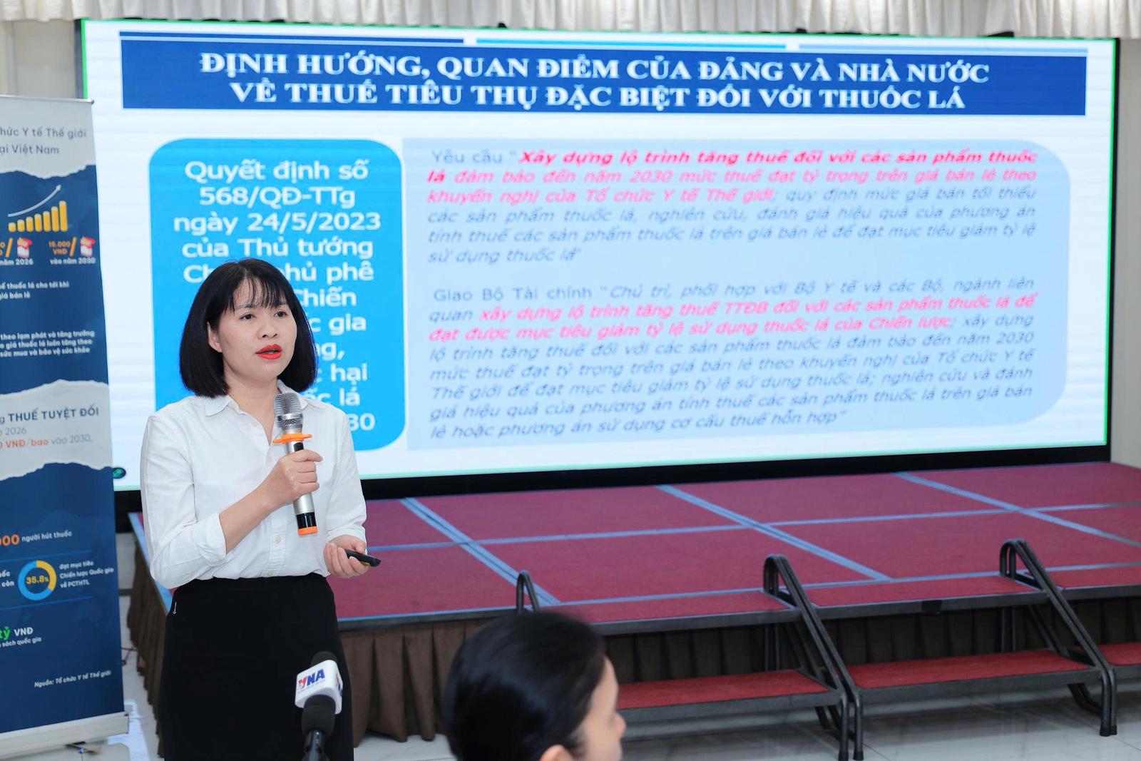 "Mức tăng thuế thuốc lá cần thiết để đạt được mục tiêu quốc gia về giảm tỷ lệ sử dụng thuốc lá đến 2030 là bổ sung thuế tuyệt đối ở mức 5.000 đồng/bao vào 2026 và tăng dần đạt 15.000 đồng/1 bao (20 điếu/1 bao) vào 2030 bên cạnh thuế tỷ lệ 75%. Tăng thuế thuốc lá được đề xuất trên cơ sở cân đối, hài hòa lợi ích của các chủ thể: Nhà nước, người dân và doanh nghiệp, vì mục tiêu bảo vệ sức khỏe người dân và sự phát triển bền vững của đất nước", bà Thủy cho biết.