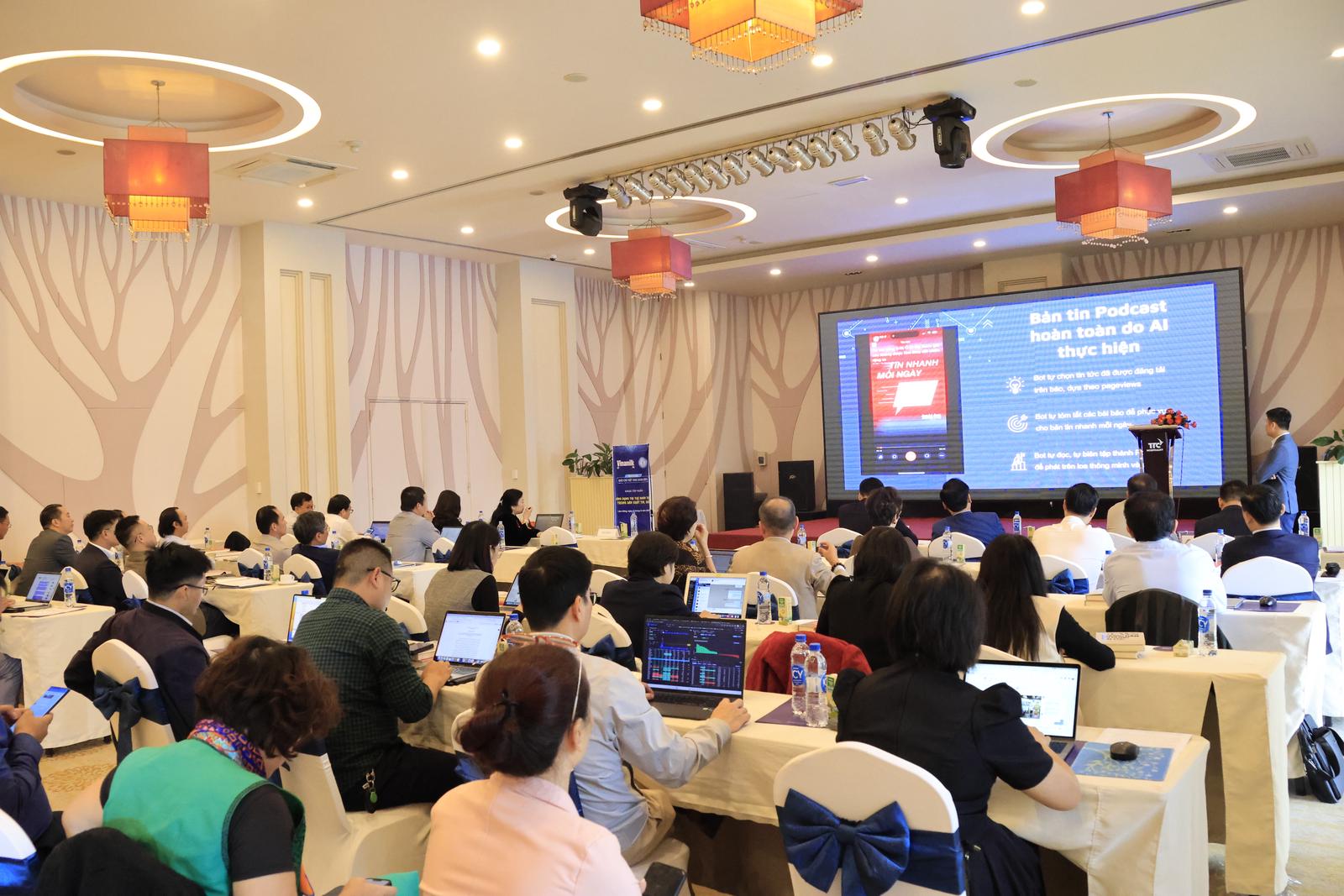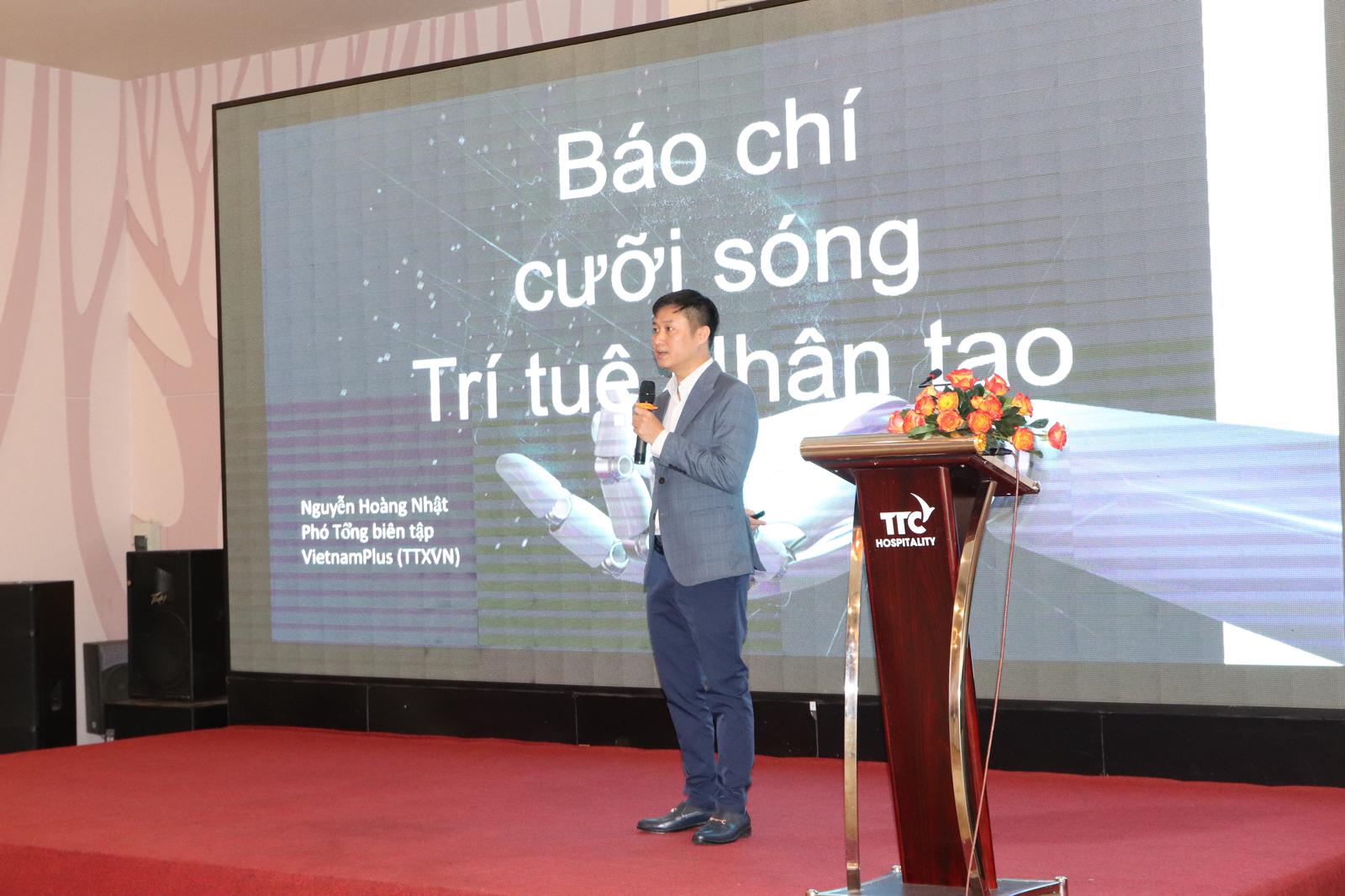 Ông Nguyễn Hoàng Nhật, Phó Tổng Biên tập Báo VietnamPlus (TTXVN) chia sẻ thông tin ứng dụng AI trong sản xuất tin bài. Ảnh: Vũ Linh