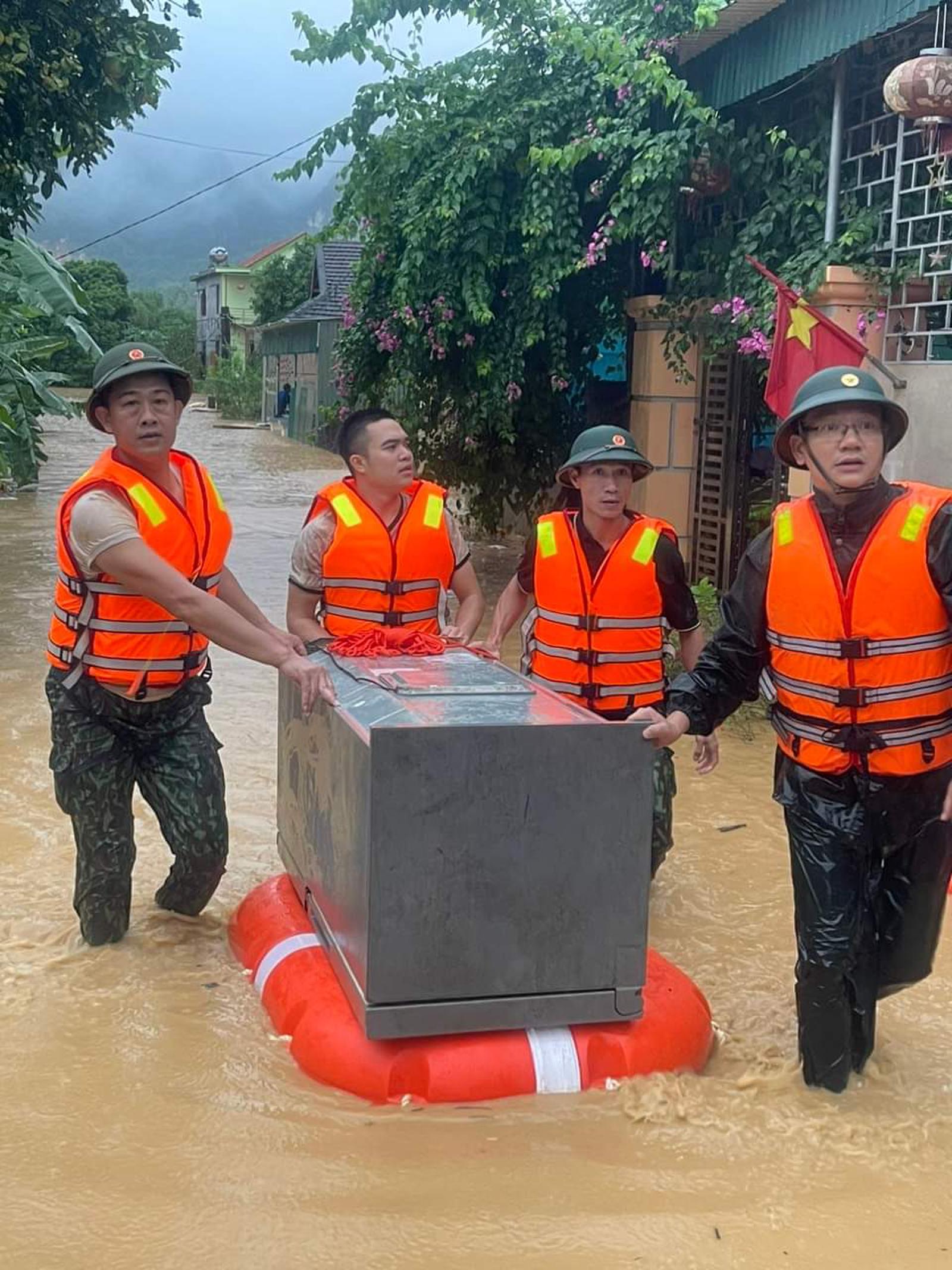 Lực lượng chức năng huyện Quỳ Châu giúp dân sơ tán và di chuyển đồ đạc ra khỏi vị trí ngập lụt. Ảnh: CSCC