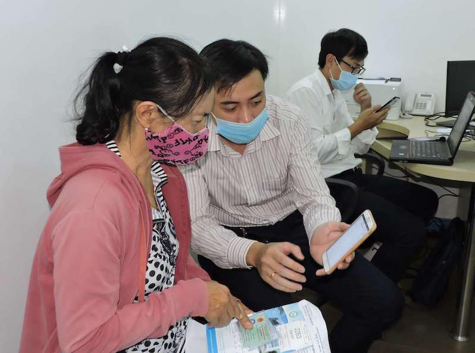 Nhân viên BHXH tỉnh Kon Tum hướng dẫn người dân cài đặt, sử dụng ứng dụng BHXH số - VssiD. Ảnh: Báo Kon Tum