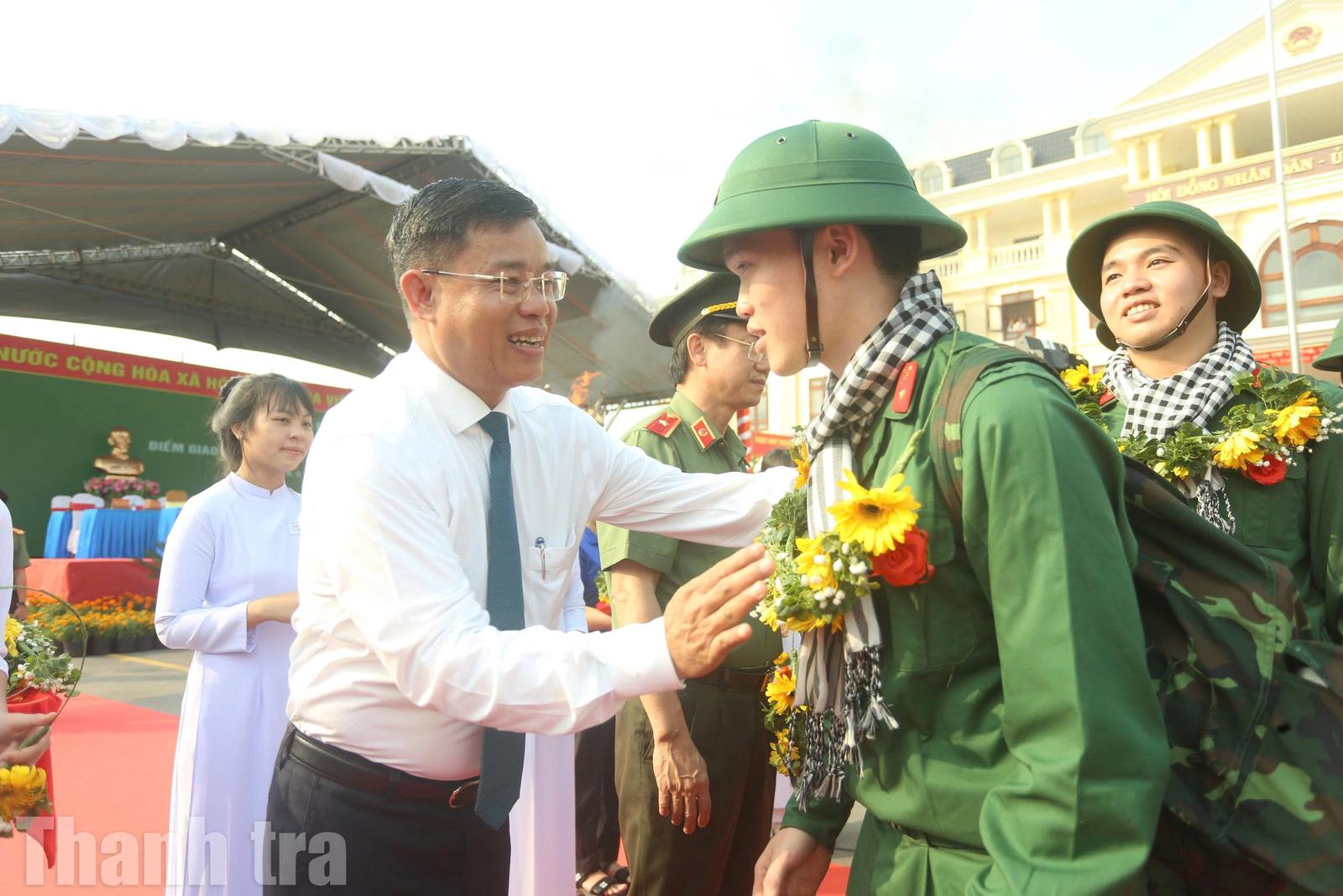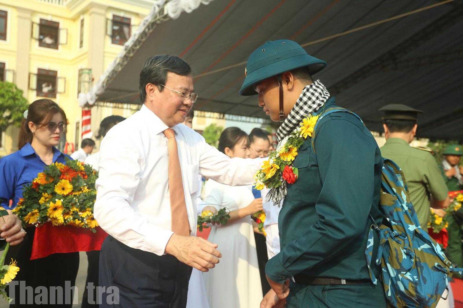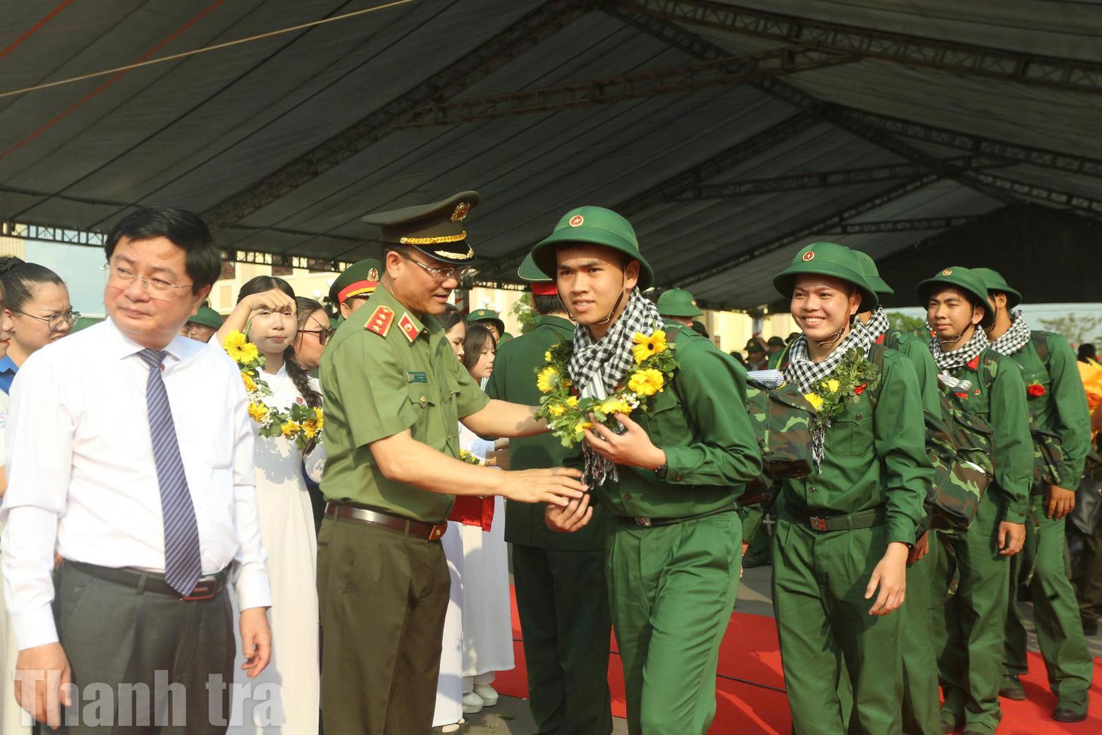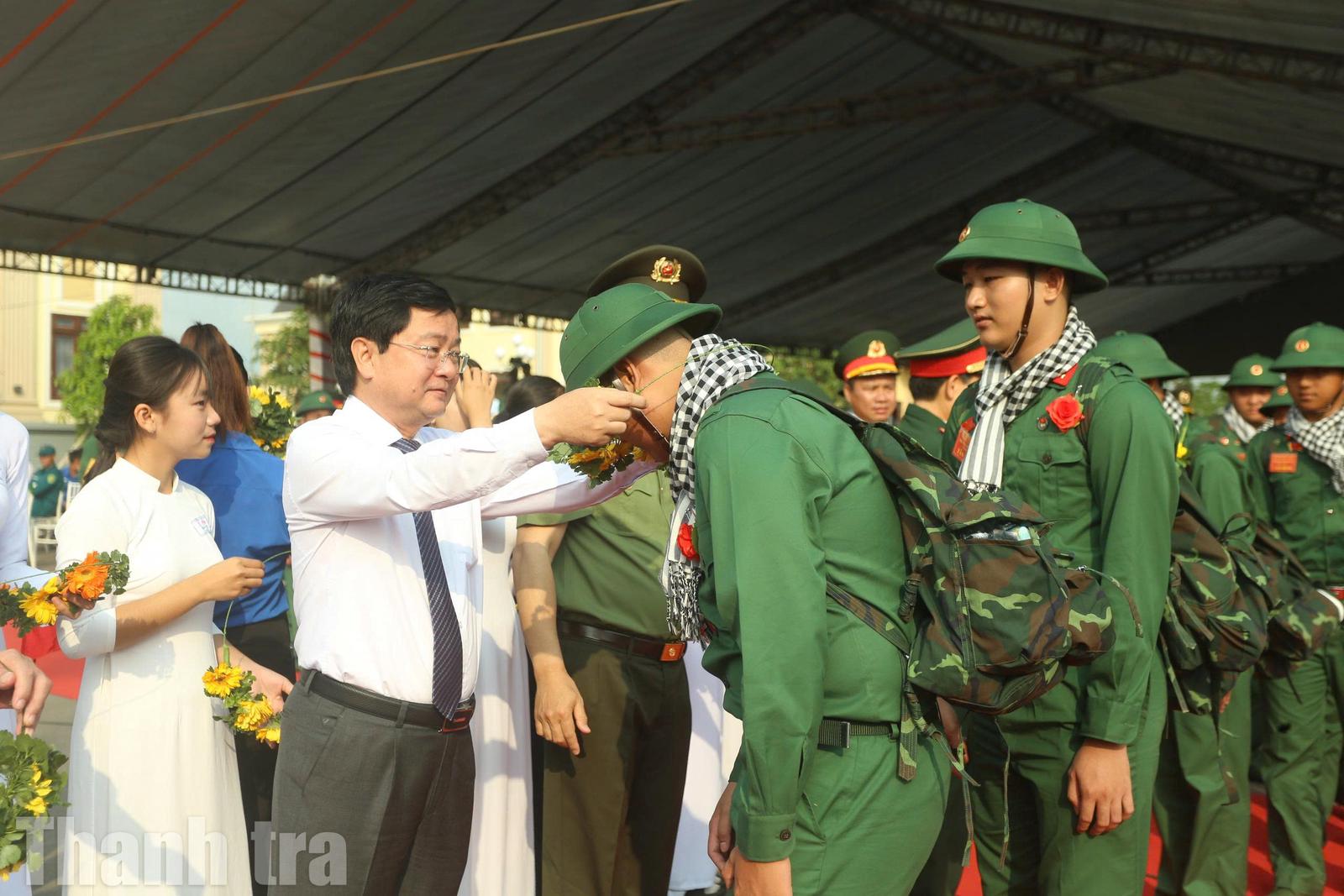 Lãnh đạo Tỉnh ủy, UBND tỉnh, Công an tỉnh và xã đeo vòng nguyệt quế cho các thanh niên lên đường nhập ngũ