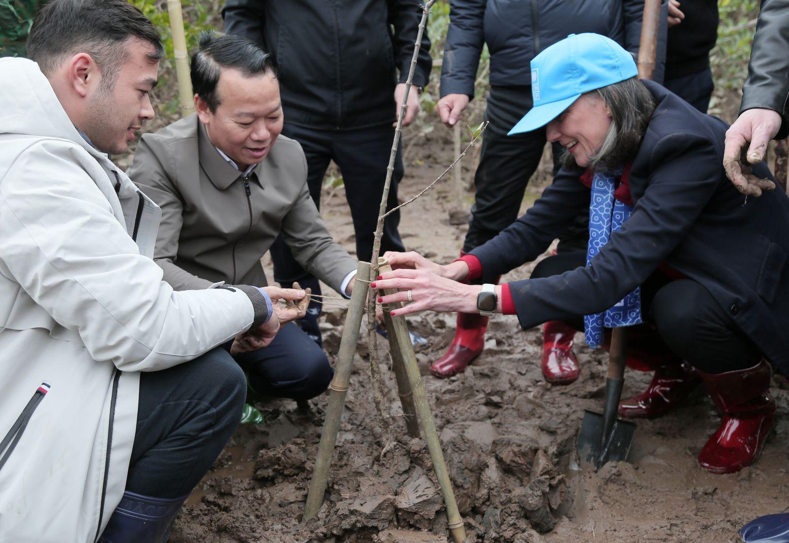 Bộ trưởng Bộ TN&MT và Trưởng đại diện Chương trình phát triển Liên hợp quốc tại Việt Nam (UNDP) trồng cây tại lễ phát động. Ảnh: HL