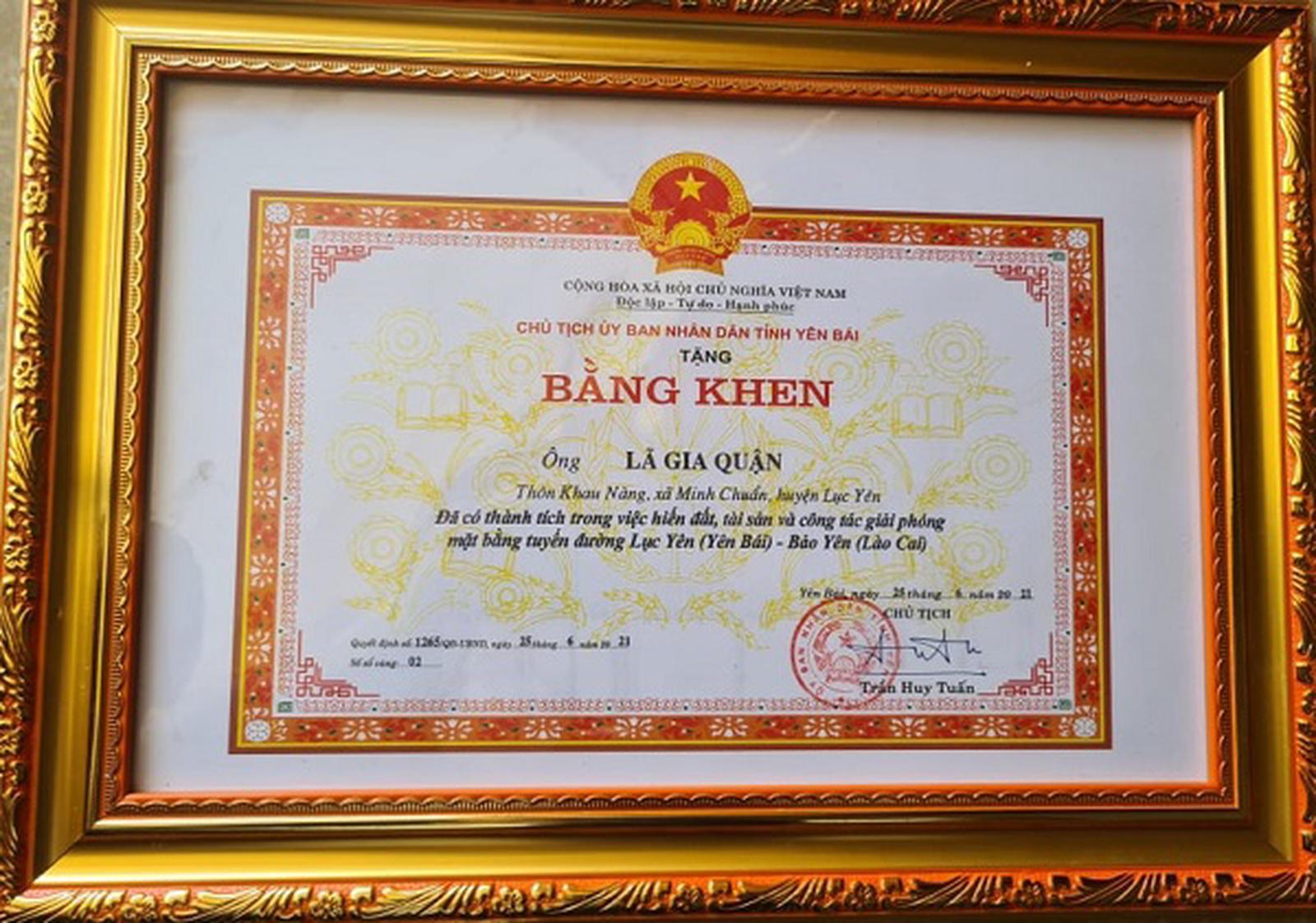Ông Lã Gia Quận được Chủ tịch UBND tỉnh Yên Bái tặng bằng khen vì có thành tích trong việc hiến đất, tài sản và công tác giải phóng mặt bằng tuyến đường Lục Yên - Bảo Yên. Ảnh: Bùi Bình