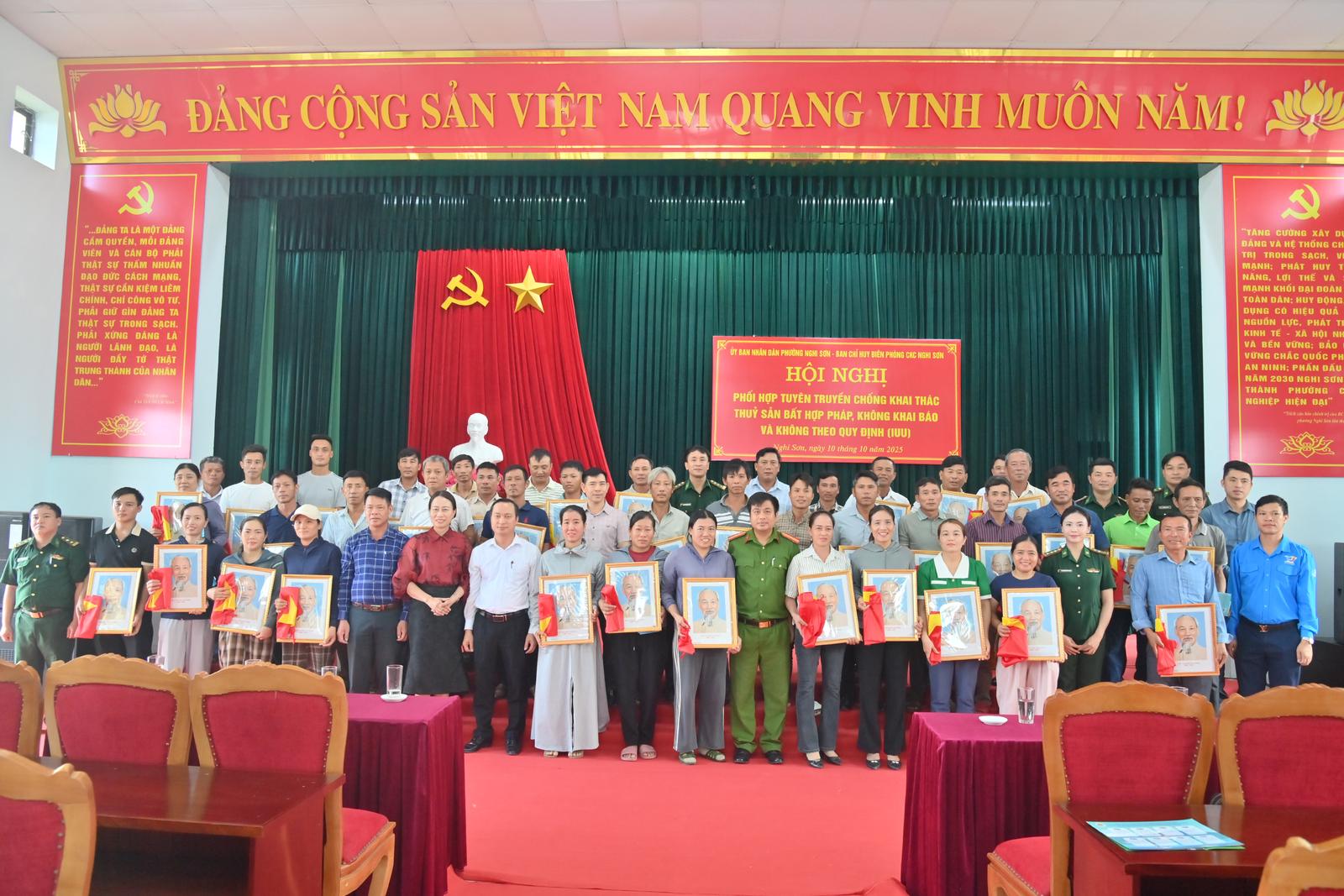 Ban Chỉ huy Biên phòng cửa khẩu cảng Nghi Sơn và lãnh đạo phường Nghi Sơn, tỉnh Thanh Hoá trao cờ Tổ quốc và ảnh Bác Hồ cho ngư dân. Ảnh: BĐBP Thanh Hoá
