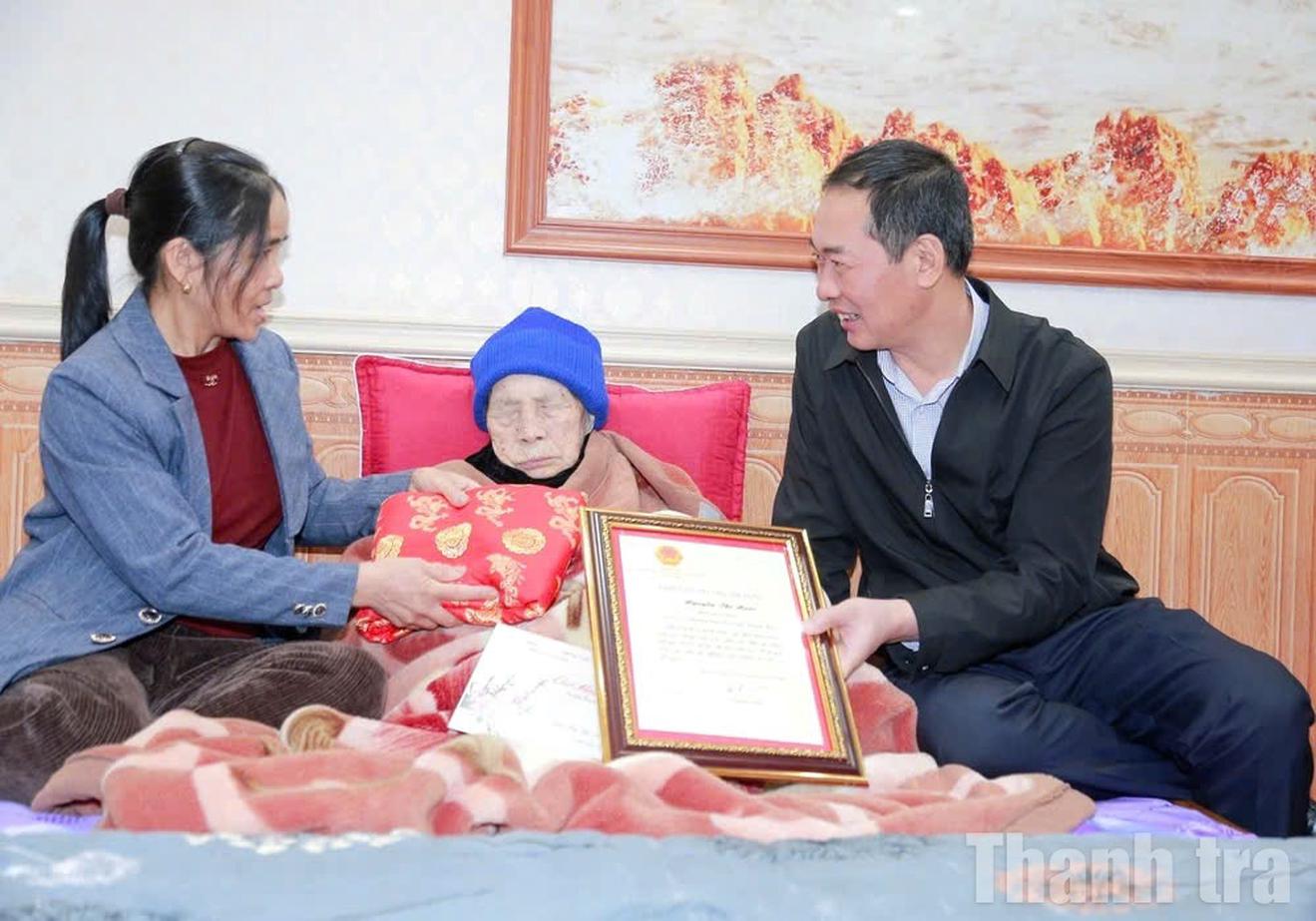 Phó Bí thư Tỉnh ủy Thanh Hóa Trịnh Tuấn Sinh thăm trao thiếp mừng thọ và quà của Chủ tịch nước tặng Mẹ Việt Nam Anh hùng Nguyễn Thị Nuôi, tròn 100 tuổi. Ảnh: Văn Thanh