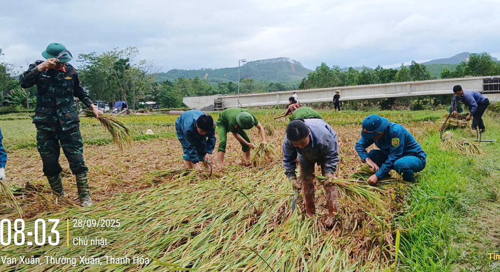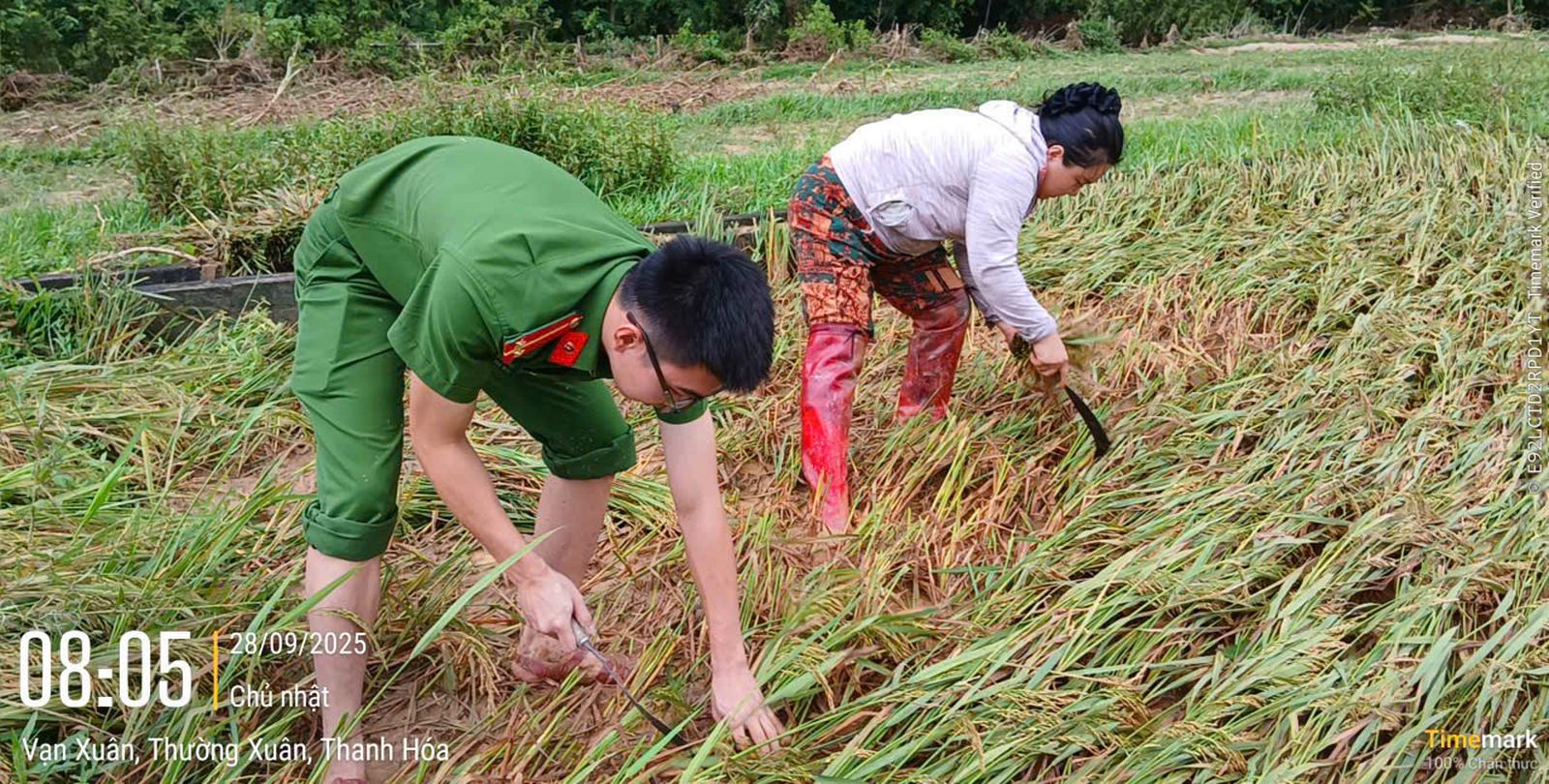 (Thanh tra) - Ngày 28/9, theo thông tin từ Công an tỉnh Thanh Hoá, đêm 27/9, do mưa lớn kèm theo lũ từ thượng nguồn đổ về khiến hơn 2ha lúa của hơn 200 hộ dân ở thôn Ná Mén, xã Vạn Xuân, tỉnh Thanh Hoá bị đổ rạp và ngập trong nước, nguy cơ mất trắng. Gần 50 cán bộ, chiến sĩ Công an xã Vạn Xuân và tổ bảo vệ an ninh, trật tự ở cơ sở đã cùng các lực lượng quân sự, thanh niên, phụ nữ xã khẩn trương xuống đồng gặp lúa trước khi bão đổ bộ.