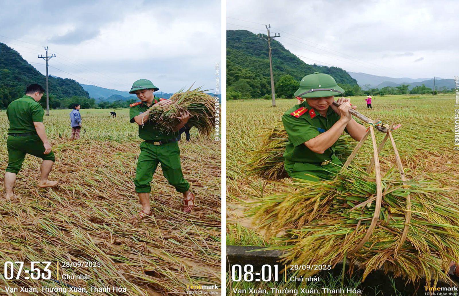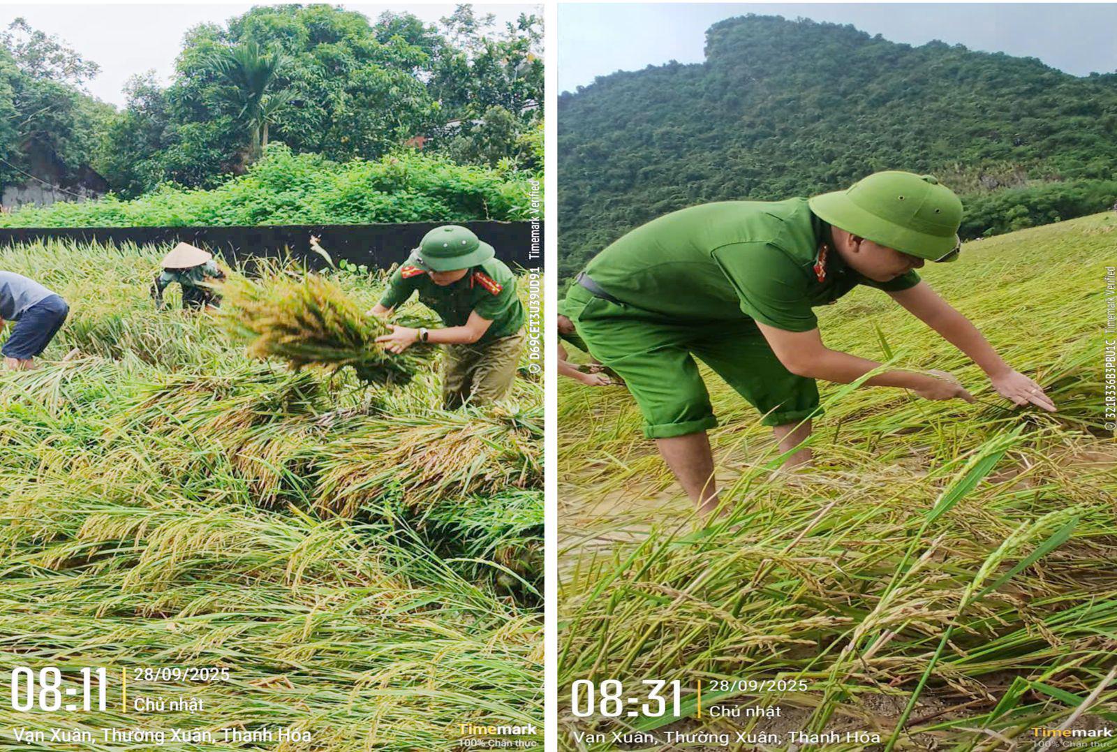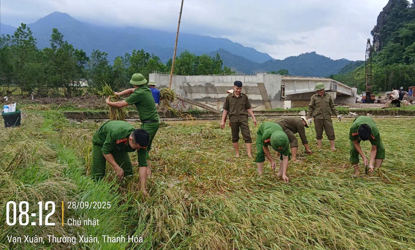 Công an xã Vạn Xuân giúp dân gặt lúa trước khi bão số 10 đổ bộ. Ảnh: Công an Thanh Hoá