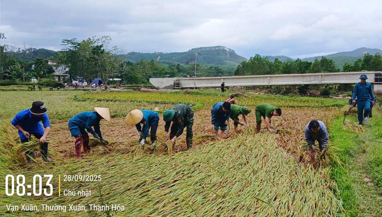 Lực lượng chức năng và bà con Nhân dân xã Vạn Xuân khẩn trương gặt lúa trước khi bão đổ bộ. Ảnh: Công an Thanh Hoá