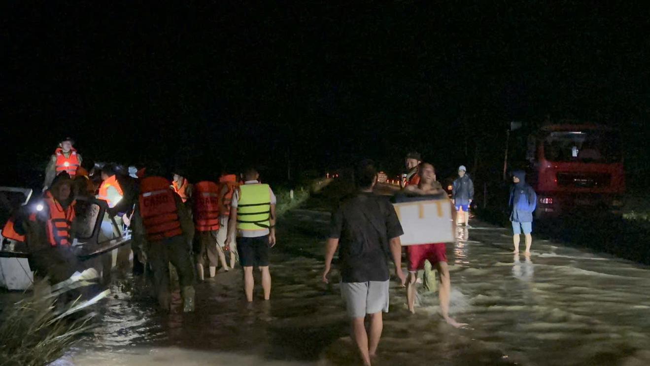 Suốt đêm 29/9, hàng chục lượt xuồng cao su đã vượt dòng nước xiết, đưa nhiều người già, trẻ nhỏ, phụ nữ mang thai ở các vùng ngập lụt đến nơi an toàn; hỗ trợ vận chuyển bệnh nhân đi cấp cứu, điều trị kịp thời. Song song với công tác cứu nạn, lực lượng chức năng cũng vận chuyển hàng trăm suất lương thực, nước uống, thuốc men và nhu yếu phẩm thiết yếu để kịp thời hỗ trợ người dân ở các thôn đang bị cô lập.