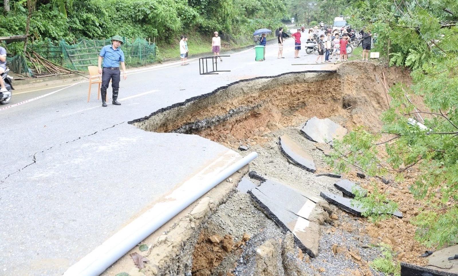Mưa bão làm đoạn sạt lở trến tuyến quốc lộ 217 đoạn quan xã Trung Hạ. Ảnh: PV