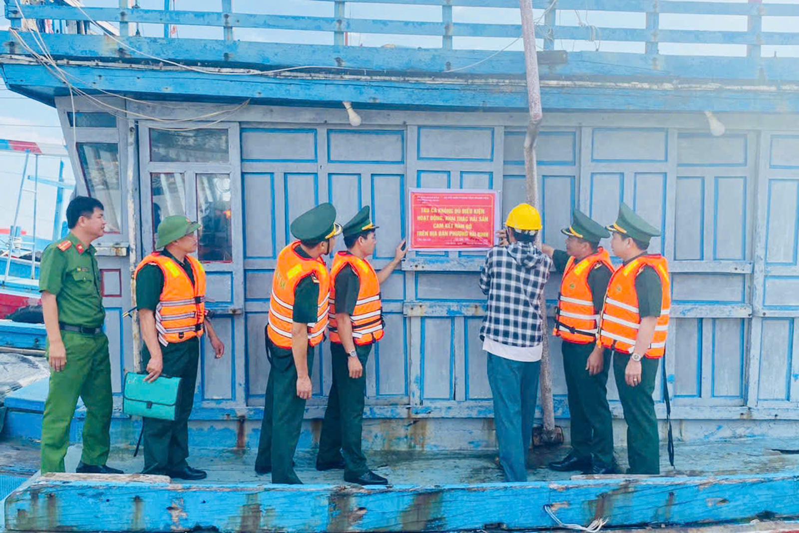 Qua kiểm đếm, xác minh, lực lượng chức năng tiến hành dán biển “Cấm đi khai thác” đối với 132 tàu cá không đủ điều kiện khai thác và yêu cầu chủ sở hữu phương tiện ký cam kết để phương tiện nằm bờ.