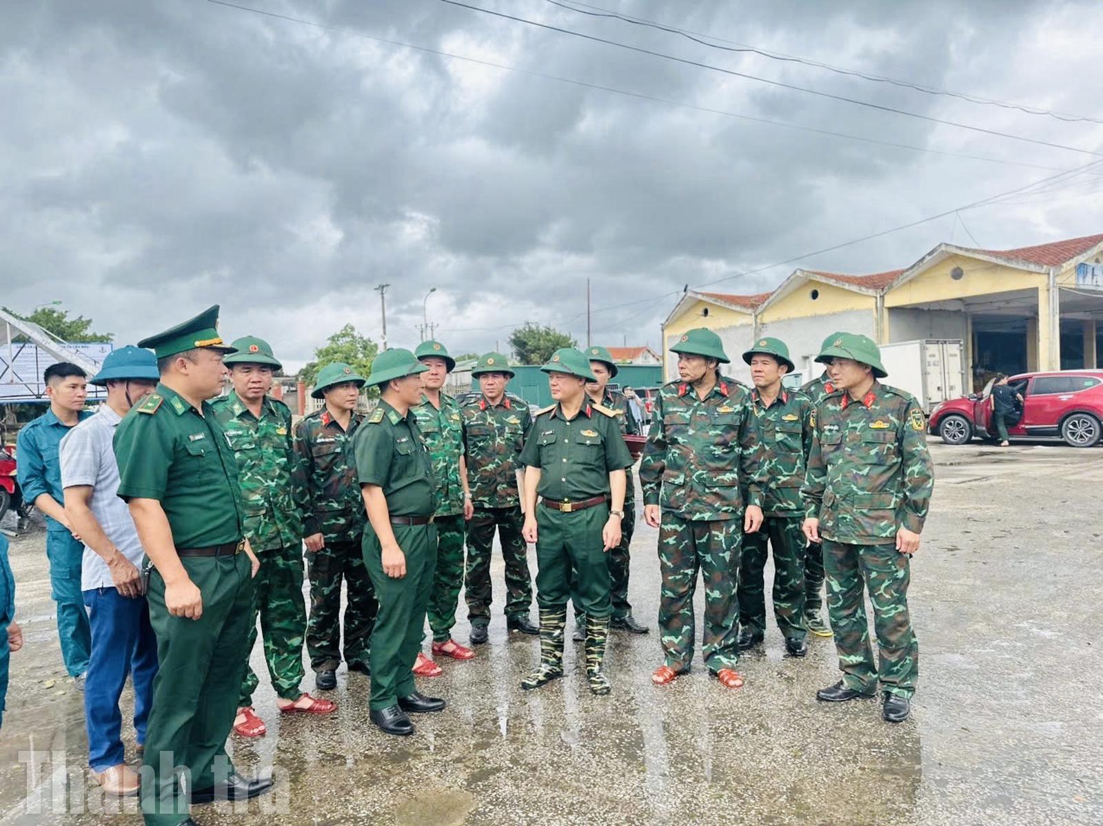 Phó Tư lệnh Quân khu 4 kiểm tra khu vực tránh trú tàu thuyền của ngư dân phường Nghi Sơn trước khi bão số 10 đổ bộ vào đất liền. Ảnh: Hương Trà