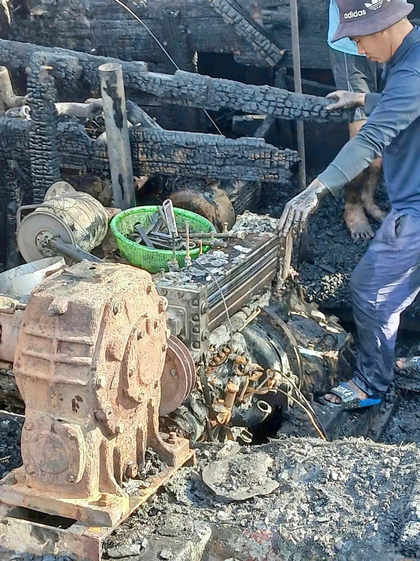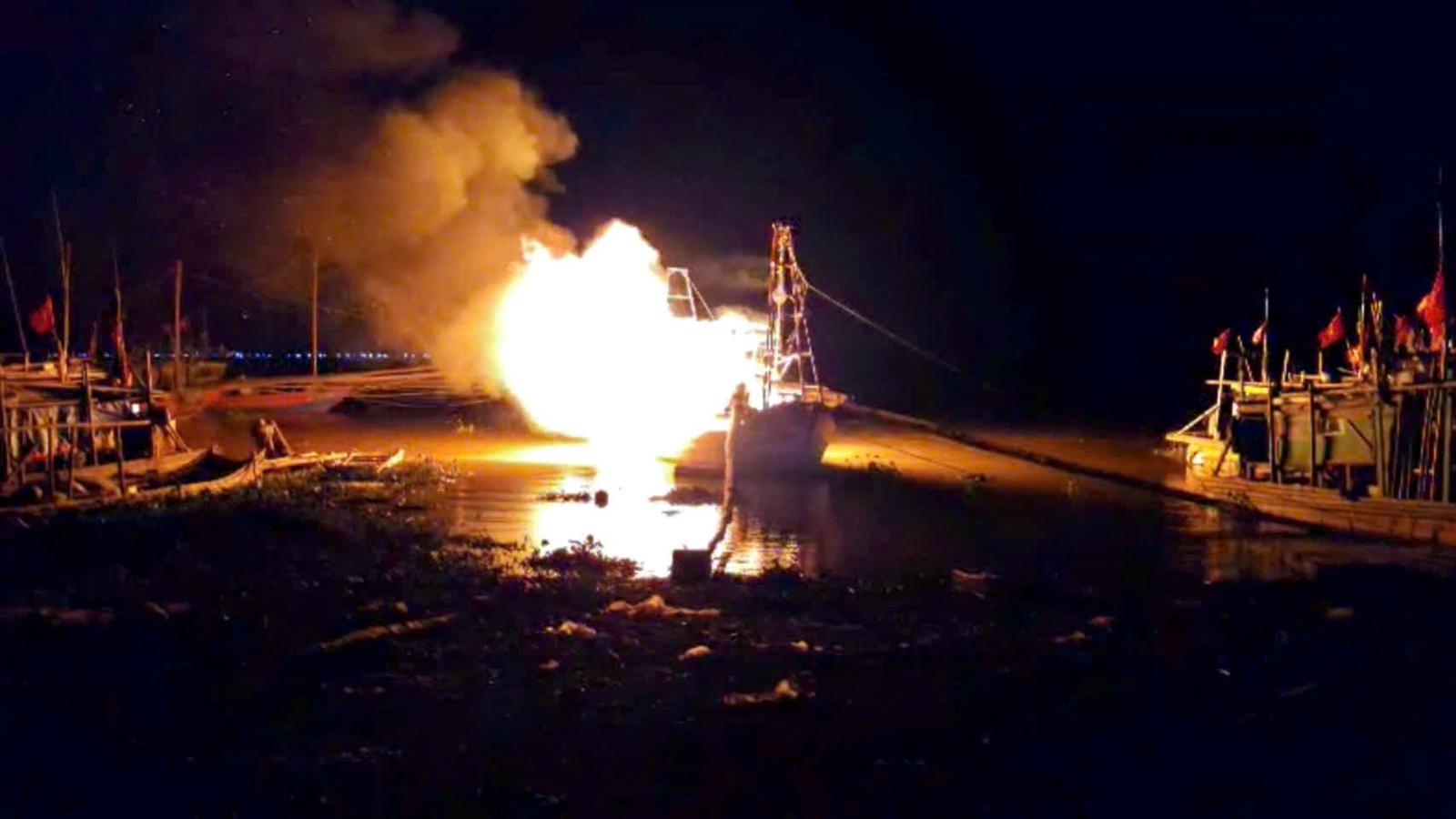 Tàu cá cháy dữ dội lúc rạng sáng, thiệt hại hàng trăm triệu đồng. Ảnh: Hương Trà