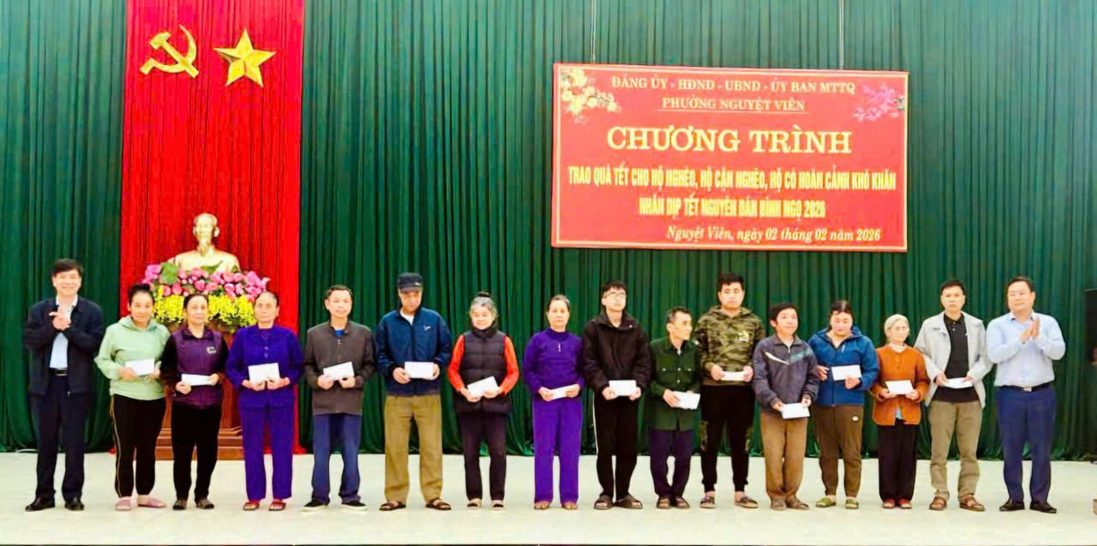 Kết quả, tổng nguồn lực huy động để chăm lo Tết Nguyên đán Bình Ngọ năm 2026 trên địa bàn phường Nguyệt Viên đạt gần 300 triệu đồng. Trong đó, nguồn xã hội hóa trên 160 triệu đồng với sự tham gia tích cực của nhiều doanh nghiệp, đơn vị và nhà hảo tâm tiêu biểu như Tổng Công ty cổ phần Hợp Lực, Hội Doanh nghiệp phường Nguyệt Viên, Ngân hàng Agribank Chi nhánh số 4, Công ty TNHH Hoàng Tuấn, Chùa Giáp Hoa…