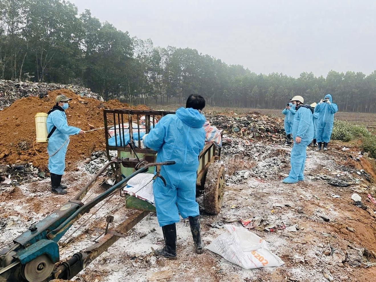 Lực lượng chức năng thực hiện tiêu huỷ lợn bệnh dịch tả Châu phi đúng quy định. Ảnh: Hương Trà