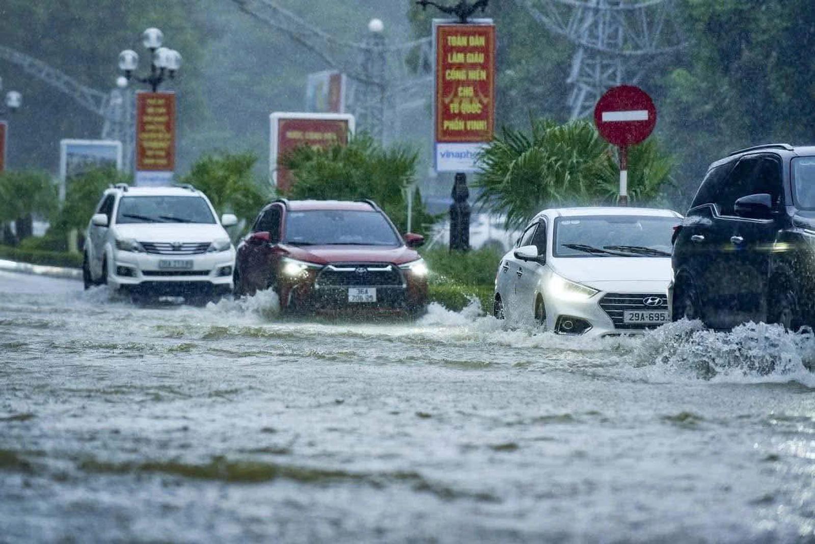Xe ô tô lội nước trong mưa do ảnh hưởng của bão số 3. Ảnh: P.V