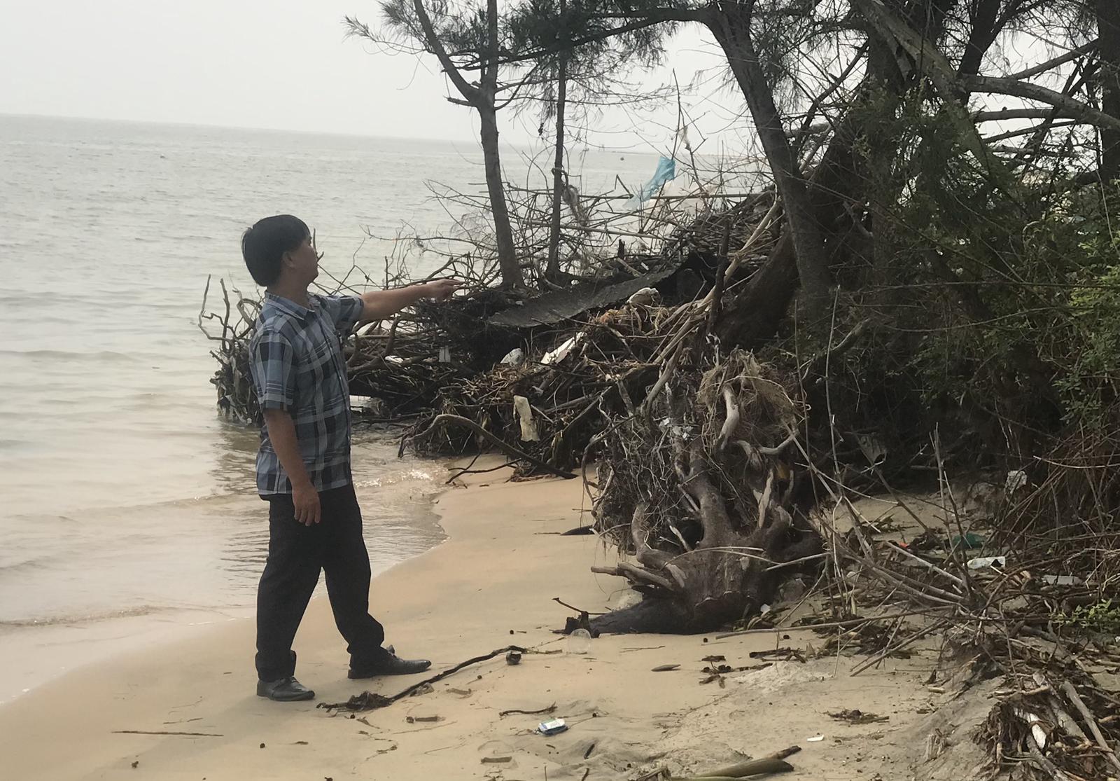 Rừng dương chắn sóng cũng bị bật gốc đổ xuống biển. Ảnh: N.P