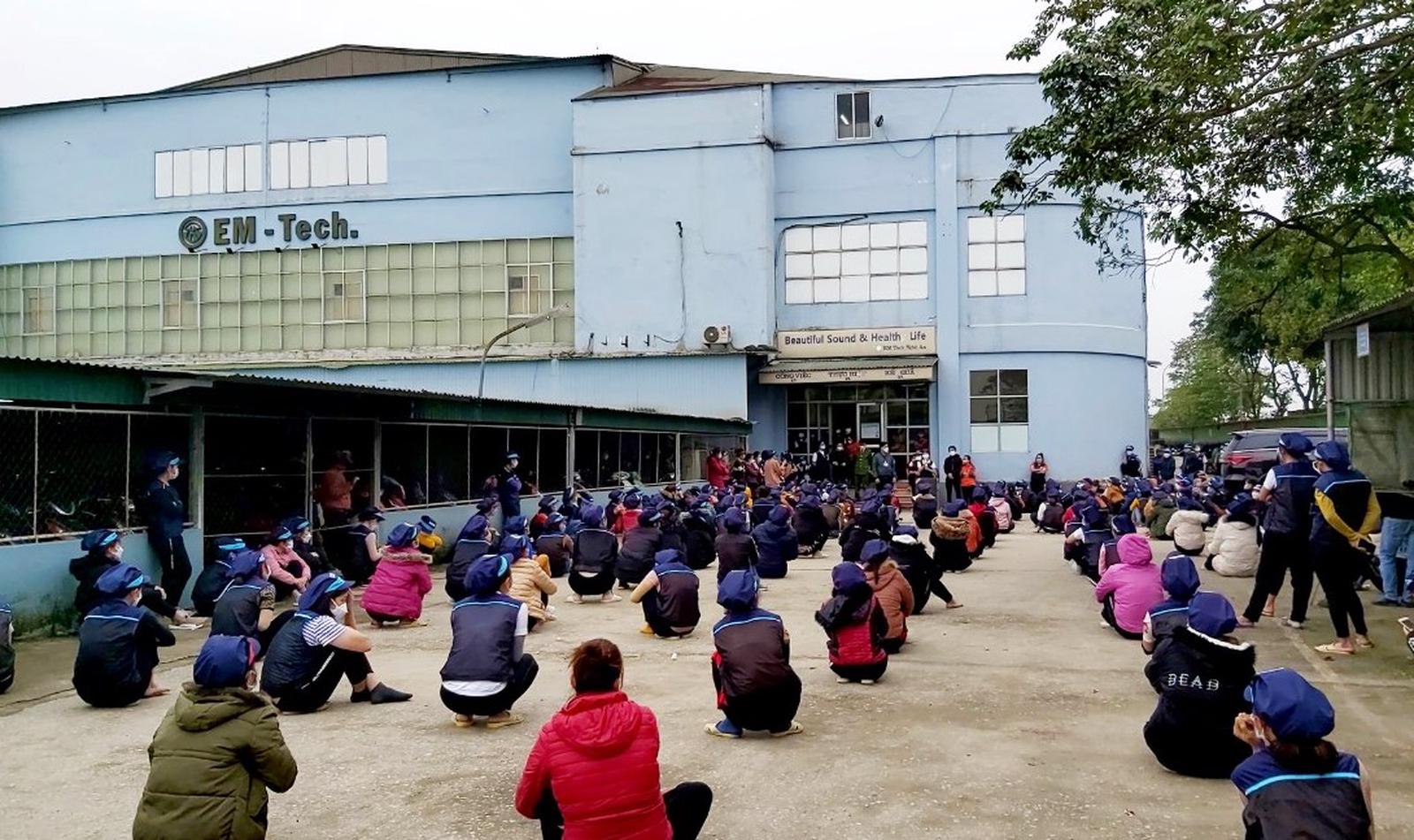 Công nhân Công ty TNHH Em-Tech Việt Nam ngừng việc tập trung sau giờ nghỉ trưa kiến nghị lên doanh nghiệp. Ảnh: Xuân Thống