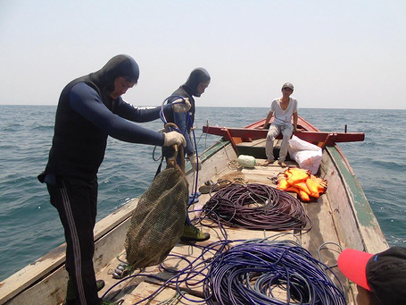 Khoảng 30 phút ngâm mình dưới đáy biển, hai "kình ngư" đã lên tàu rất vội vàng vì sợ nhiễm độc.