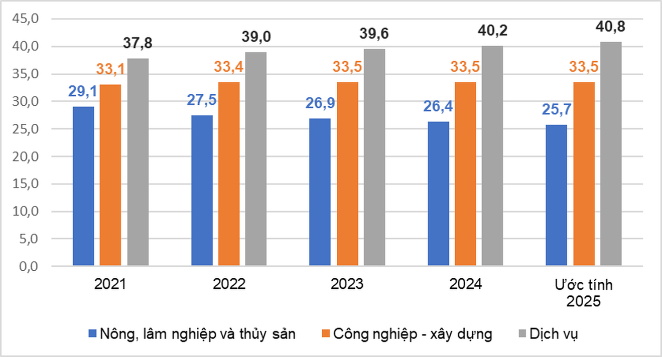 Cơ cấu lao động có việc làm phân theo khu vực kinh tế, giai đoạn 2021 - 2025 (%). Ảnh: NSO