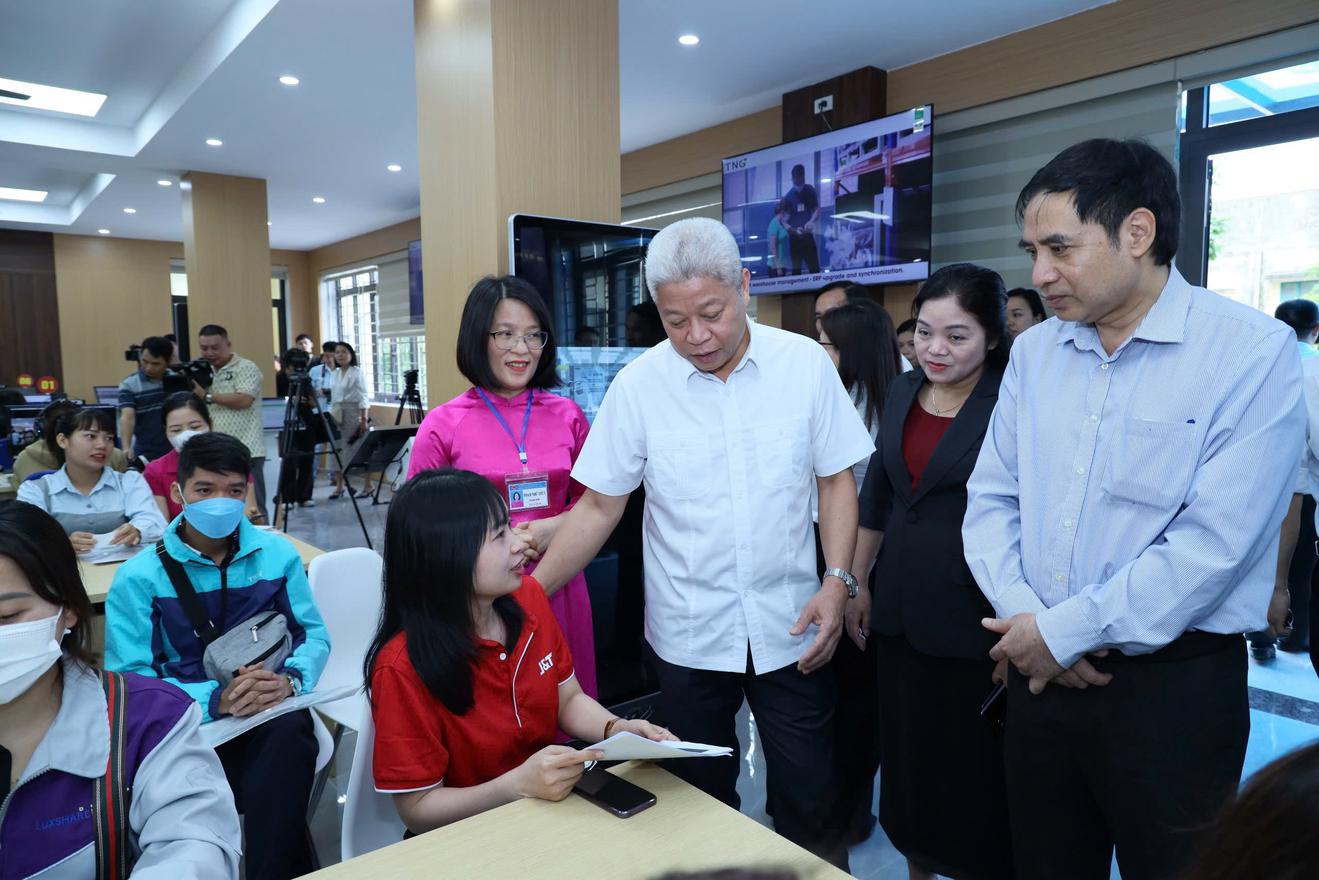 Thứ trưởng Bộ Nội vụ Nguyễn Mạnh Khương hỏi thăm người lao động tham gia Ngày hội việc làm tỉnh Thái Nguyên. Ảnh: BNV