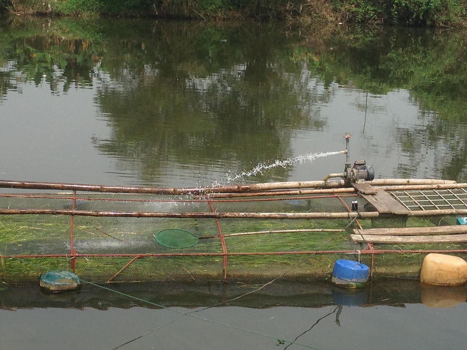 Người dân sử dụng máy bơm để tạo ô xi trong lồng nhưng cá vẫn tiếp tục chết. Ảnh: N.H