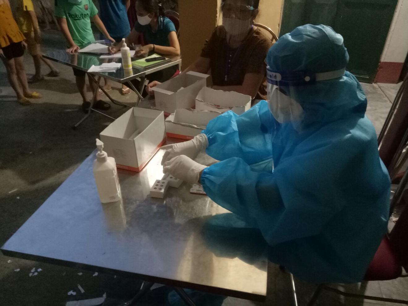 Nữ y tá Doãn Thị Hương miệt mài lấy mẫu xét nghiệm cho người dân trong đêm. Ảnh: VT