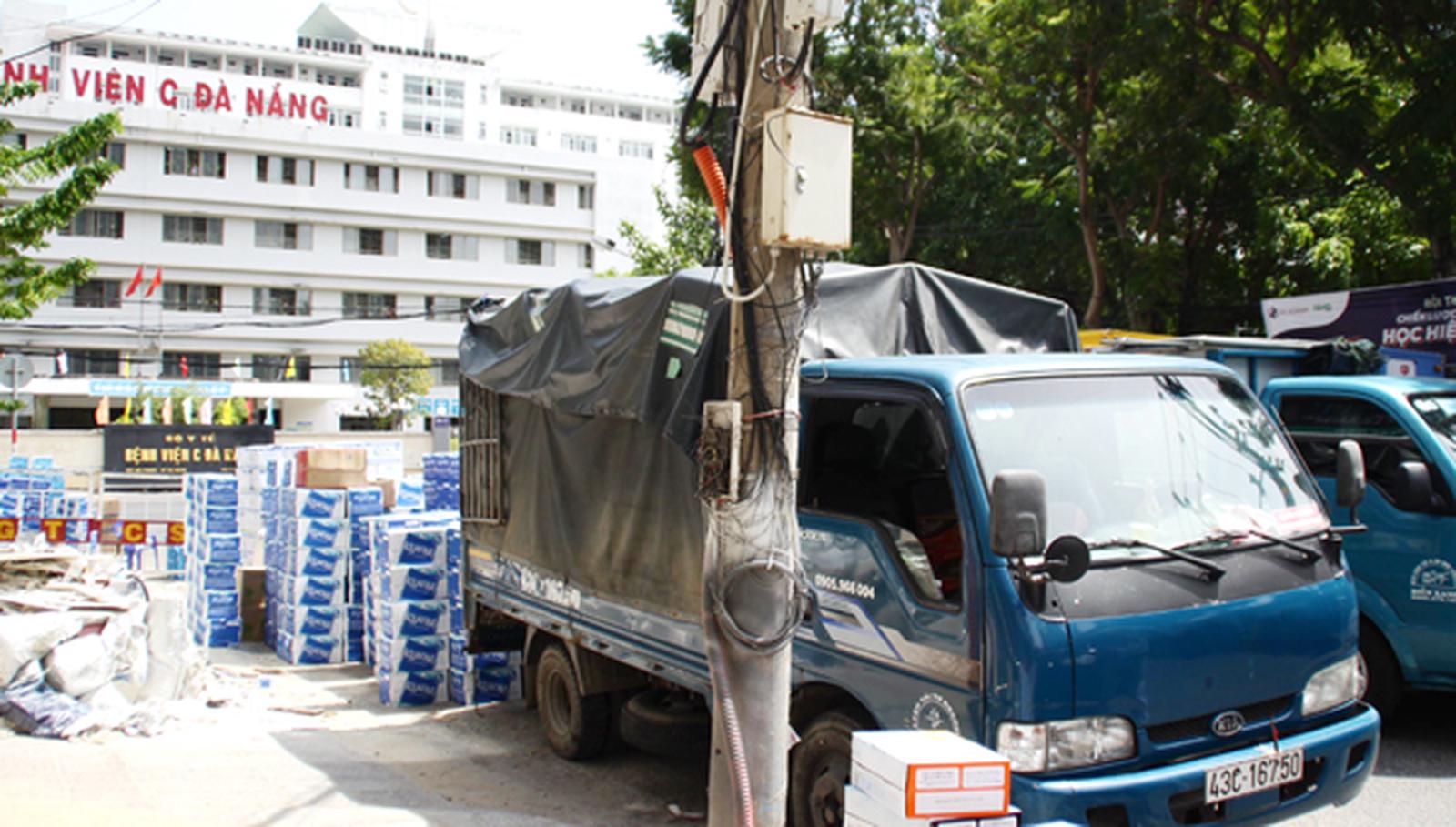 Bệnh viện C Đà Nẵng được ô tô chở hàng đến cứu trợ. Ảnh: Đức bình