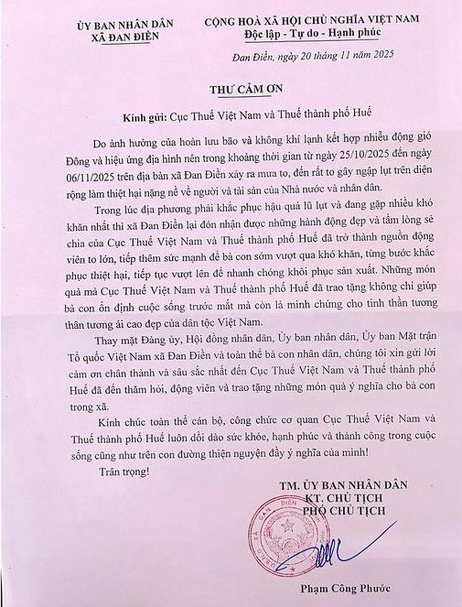 Thư cảm ơn của UBND xã Đan Điền, TP Huế. Nguồn: Cục Thuế
