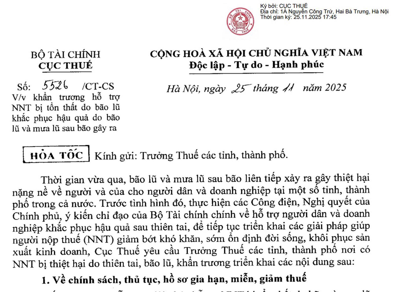 Cục Thuế ban hành Công văn số 5526/CT-CS ngày 25/11/2025 hỏa tốc gửi Trưởng Thuế các tỉnh, thành phố, yêu cầu khẩn trương hỗ trợ người nộp thuế bị tổn thất do bão lũ khắc phục hậu quả do bão lũ và mưa lũ sau bão gây ra. Nguồn: Cục Thuế