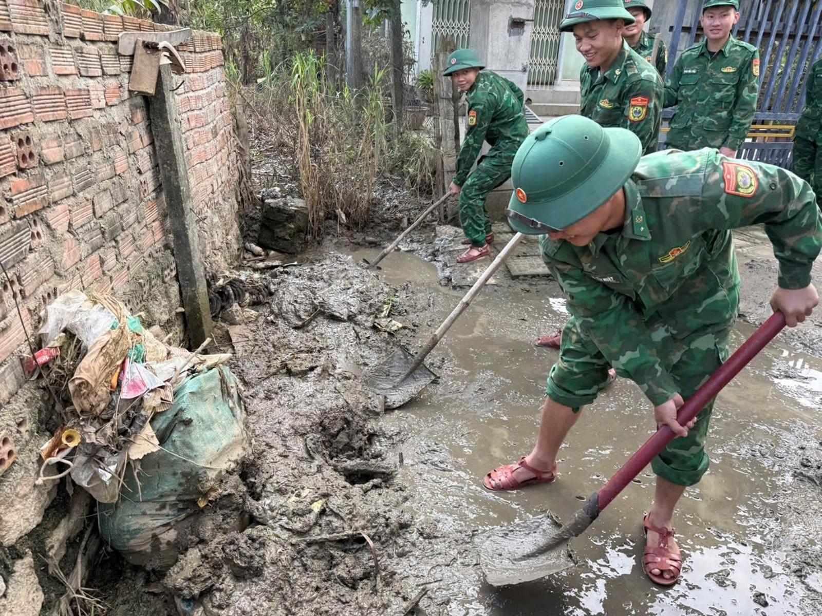 Phát huy tinh thần xung kích của tuổi trẻ Bộ đội Biên phòng, Chi đoàn Đồn Biên phòng cửa khẩu cảng Vũng Rô đã tổ chức lực lượng xuống thôn Phú Khê 2 hỗ trợ Nhân dân sau thiên tai. Ảnh: BĐBP Đắk Lắk