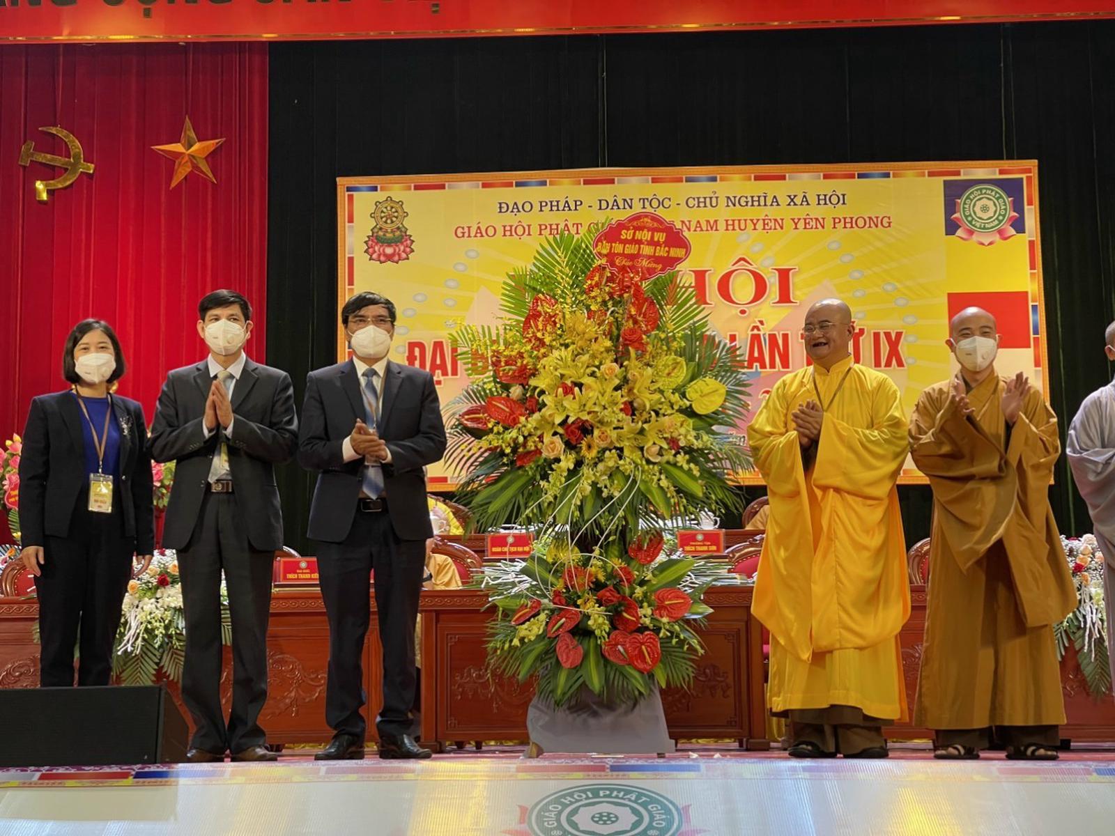 Lãnh đạo Sở Nội vụ - Ban Tôn giáo tỉnh Bắc Ninh tặng hoa chúc mừng Đại hội Đại biểu Phật giáo huyện Yên Phong nhiệm kỳ VIII (2021-2026). Ảnh: Ban Tôn giáo Bắc Ninh