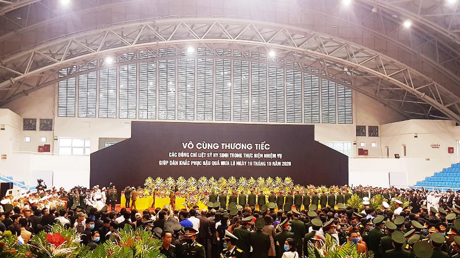 Sáng nay, Đảng ủy, Bộ Tư lệnh Quân khu 4; Tỉnh ủy, HĐND, UBND, MTTQ Việt Nam tỉnh Quảng Trị cùng thân nhân các liệt sĩ tổ chức trọng thể lễ viếng, lễ truy điệu và tiễn đưa 22 đồng chí sĩ quan, quân nhân chuyên nghiệp, chiến sĩ của Đoàn Kinh tế Quốc phòng 337 hy sinh trong khi làm nhiệm vụ giúp dân khắc phục hậu quả mưa lũ ngày 18/10 tại xã Hướng Phùng, huyện Hướng Hóa.