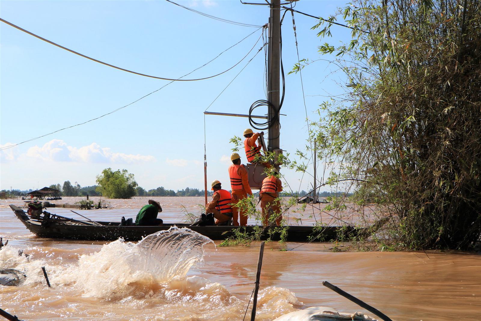 Thi công lưới điện trong mùa lũ tại huyện Hồng Ngự, tỉnh Đồng Tháp